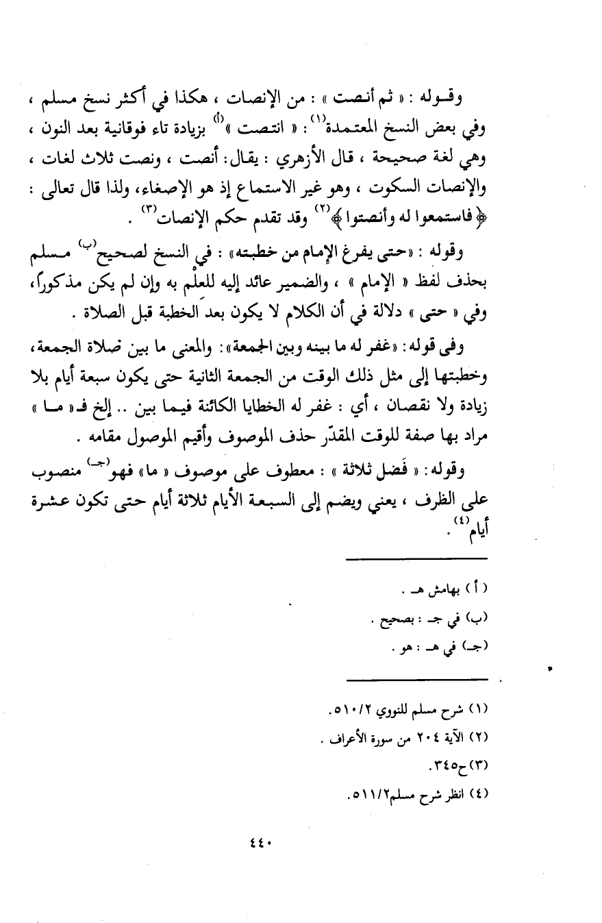 وقوله: "ثم أنصت": من الإنصات، هكذا في أكثر نسخ مسلم، وفي بعض النسخ المعتمدة (¬1): "انتصت" (أ) بزيادة تاء فوقانية بعد النون، وهي لغة صحيحة، قال الأزهري: يقال: أنصت، ونصت ثلاث لغات، والإنصات السكوت، وهو غير الاستماع إذ هو الإصغاء، ولذا قال تعالى: {فاستمعوا له وأنصتوا} (¬2) وقد تقدم حكم الإنصات (¬3).