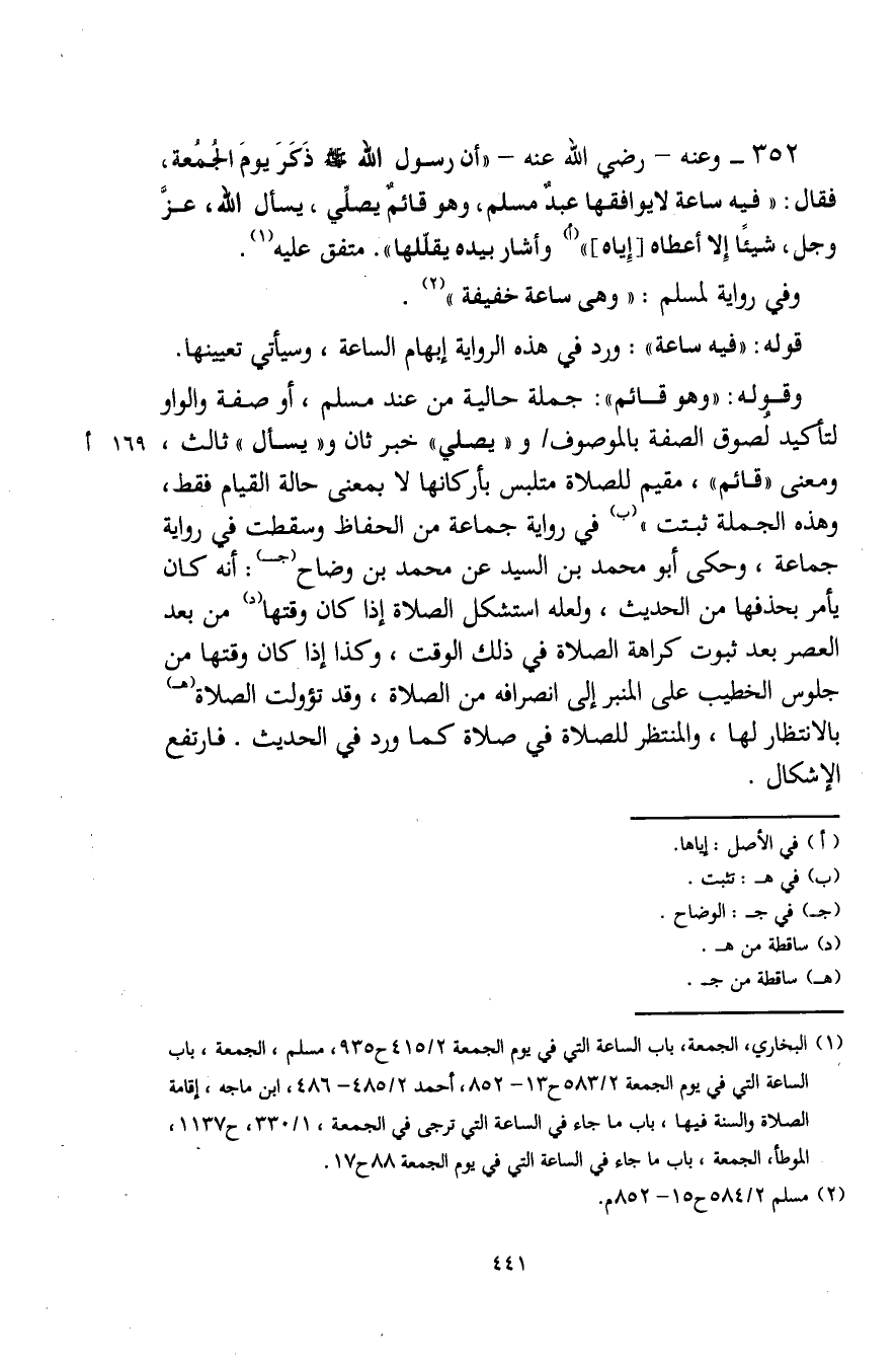 (¬1) البخاري، الجمعة، باب الساعة التي في يوم الجمعة 2/ 415 ح 935، مسلم، الجمعة، باب الساعة التي في يوم الجمعة 2/ 583 ح 13 - 852، أحمد 2/ 485 - 486، ابن ماجه، إقامة الصلاة والسنة فيها، باب ما جاء في الساعة التي ترجى في الجمعة، 1/ 330، ح 1137، الموطأ، الجمعة، باب ما جاء في الساعة التي في يوم الجمعة 88 ح 17.