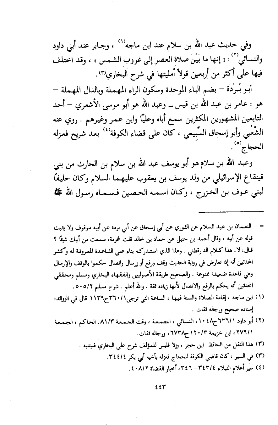 = النعمان بن عبد السلام عن الثوري عن أبي إسحاق عن أبي بردة عن أبيه موقوف ولا يثبت قوله عن أبيه، وقال أحمد بن حنبل عن حماد بن خالد قلت لمخرمة: سمحت من أبيك شيئًا؟ قال: لا. هذا كلام الدارقطني. وهذا الذي استدركه بناء على القاعدة المعروفة له وأكثر المحدثين أنه إذا تعارض في رواية الحديث وقف ورفع أو إرسال واتصال حكموا بالوقف والإرسال وهي قاعدة ضعيفة ممنوعة. والصحيح طريقة الأصوليين والفقهاء البخاري ومسلم ومحققي المحدثين أنه يحكم بالرفع والاتصال لأنها زيادة ثقة. والله أعلم. شرح مسلم 2/ 505.