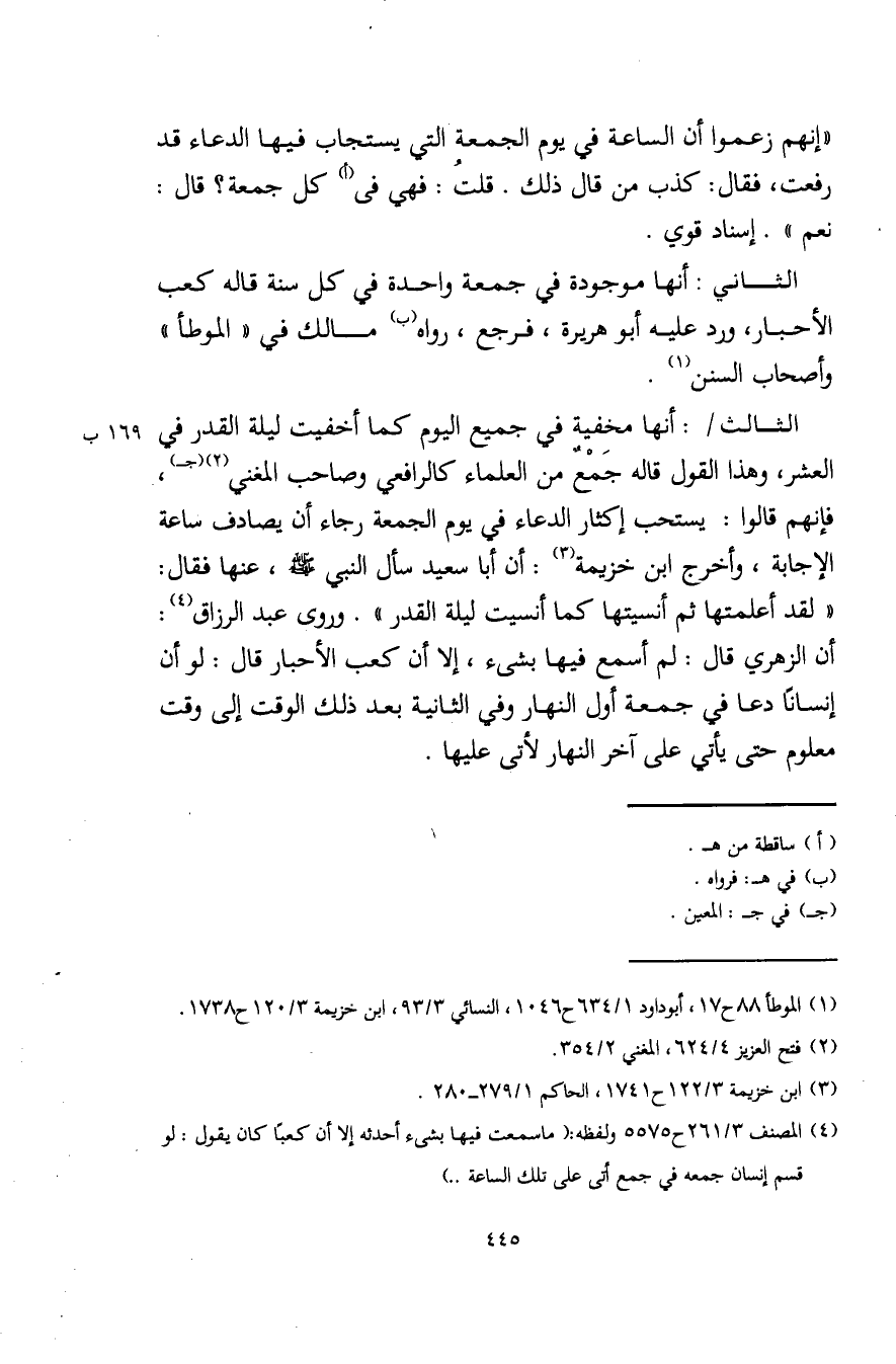 (¬4) المصنف 3/ 261 ح 5575 ولفظه: (ما سمعت فيها بشيء أحدثه إلا أن كعبًا كان يقول: لو قسم إنسان جمعه في جمع أتى على تلك الساعة ..).