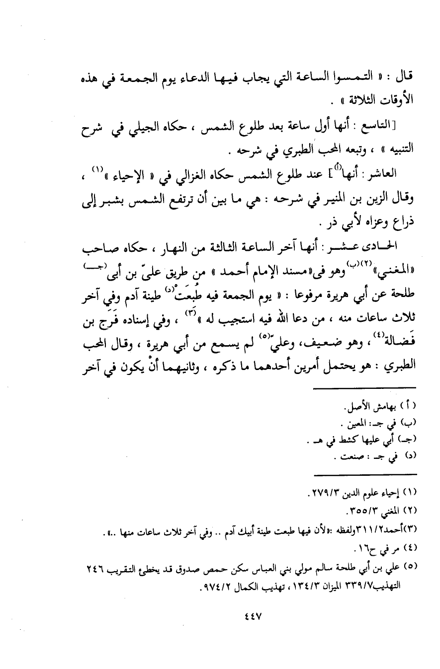 الحادي عشر: أنها آخر الساعة الثالثة من النهار، حكاه صاحب "المغني" (¬2) (ب) وهو في "مسند الإمام أحمد" من طريق علي بن أبي (جـ) طلحة عن أبي هريرة مرفوعًا: "يوم الجمعة فيه طُبِعَتْ (د) طينة آدم وفي آخر ثلاث ساعات منه، من دعا الله فيه استجيب له" (¬3)، وفي إسناده فرج بن فَضالة (¬4)، وهو ضعيف، وعليّ (¬5) لم يسمع من أبي هريرة، وقال المحب الطبري: هو يحتمل أمرين أحدهما ما ذكره، وثانيهما أنْ يكون في آخر