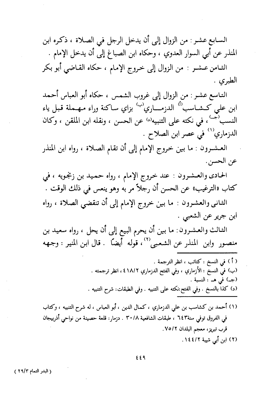 التاسع عشر: من الزوال إلى غروب الشمس، حكاه أبو العباس أحمد بن علي كشاسب (أ) الدزماري (ب) بزاي ساكنة وراء مهملة قبل ياء النسب (جـ)، في نكته على التنبيه (د) عن الحسن، ونقله ابن الملقن، وكان الدزماري (¬1) في عصر ابن الصلاح.