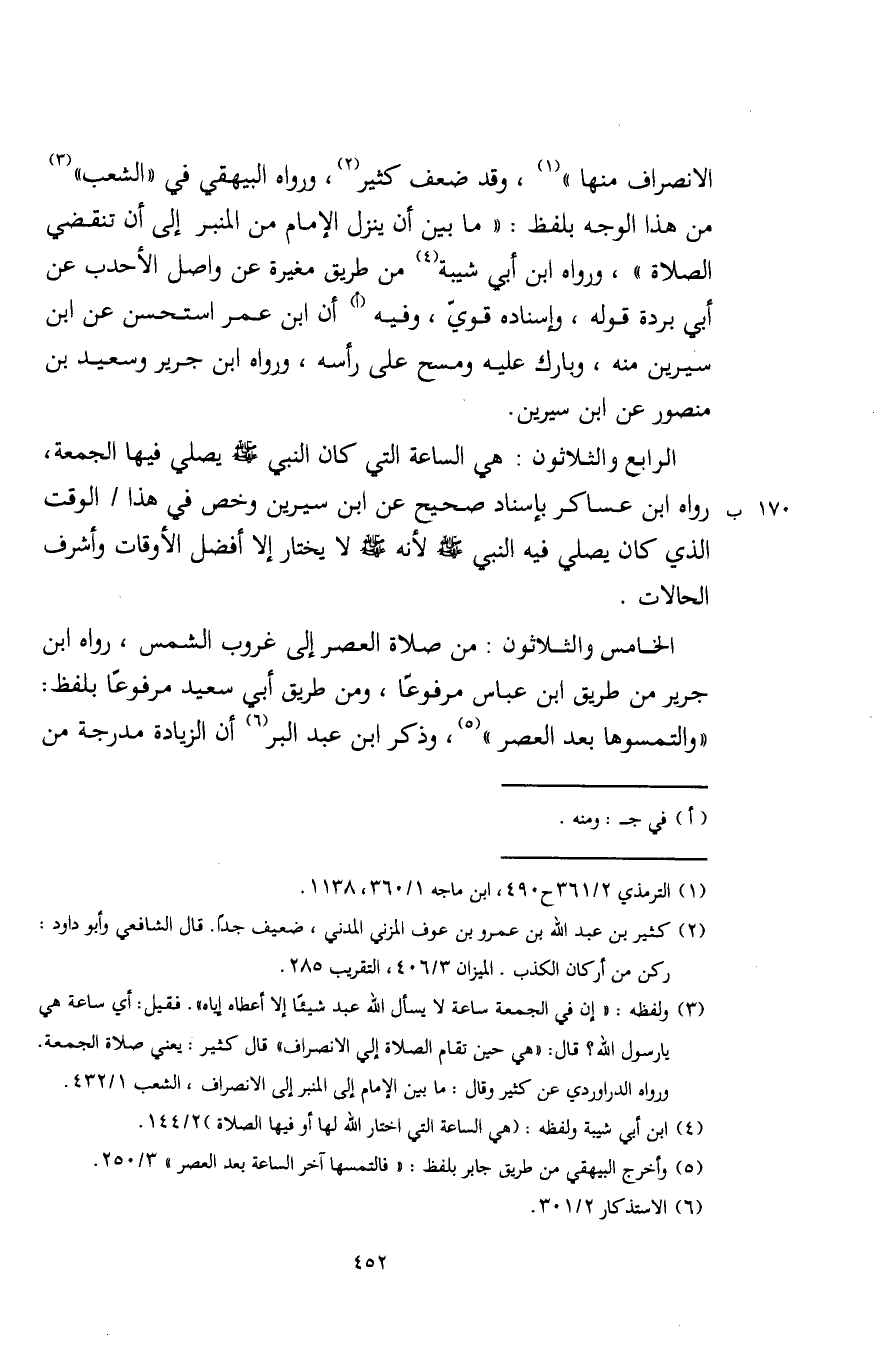 الانصراف منها" (¬1)، وقد ضعف كثير (¬2)، ورواه البيهقي في "الشعب" (¬3) من هذا الوجه بلفظ: "ما بين أن ينزل الإمام من المنبر إلى أن تنقضي الصلاة"، ورواه ابن أبي شيبة (¬4) من طريق مغيرة عن واصل الأحدب عن أبي بردة قوله، وإسناده قويّ، وفيه (أ) أن ابن عمر استحسن عن ابن سيرين منه، وبارك عليه ومسح على رأسه، ورواه ابن جرير وسعيد بن منصور عن ابن سيرين.