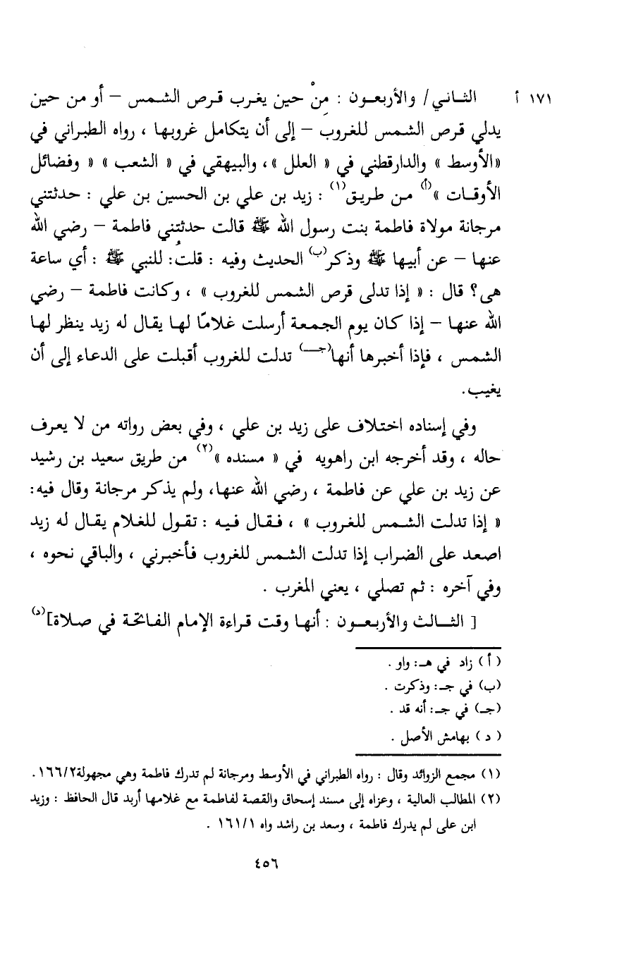 (¬2) المطالب العالية، وعزاه إلى مسند إسحاق والقصة لفاطمة مع غلامها أريد قال الحافظ: وزيد بن علي لم يدرك فاطمة، وسعد بن راشد واه 1/ 161.