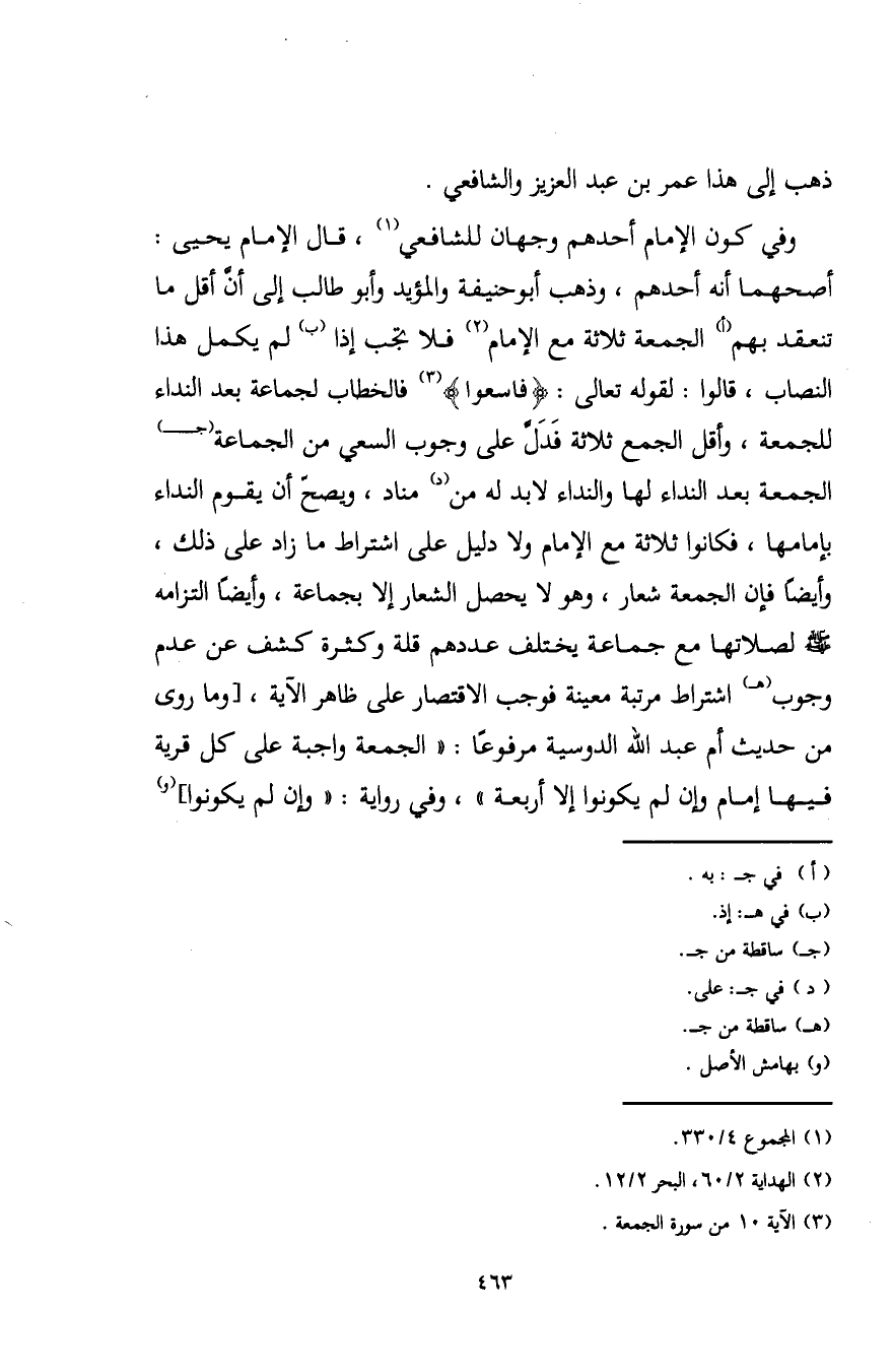 وفي كون الإمام أحدهم وجهان للشافعي (¬1)، قال الإمام يحيى: أصحهما أنه أحدهم، وذهب أبو حنيفة والمؤيد وأبو طالب إلى أنَّ أقل ما تنعقد بهم (أ) الجمعة ثلاثة مع الإمام (¬2) فلا تجب إذا (ب) لم يكمل هذا النصاب، قالوا: لقوله تعالى: {فَاسْعَوْا} (¬3) فالخطاب لجماعة بعد النداء للجمعة، وأقل الجمع ثلالة فَدَلَّ على وجوب السعي من الجماعة (جـ) الجمعة بعد النداء لها والنداء لا بد له من (د) مناد، ويصحّ أن يقوم النداء بإمامها، فكانوا ثلاثة مع الإمام ولا دليل على اشتراط ما زاد على ذلك، وأيضًا فإن الجمعة شعار، وهو لا يحصل الشعار إلا بجماعة، وأيضًا التزامه - صلى الله عليه وسلم - لصلاتها مع جماعة يختلف عددهم قلة وكثرة كشف عن عدم وجوب (هـ) اشتراط مرتبة معينة فوجب الاقتصار على ظاهر الآية، [وما روى من حديث أم عبد الله الدوسية مرفوعًا: "الجمعة واجبة على كل قرية فيها إمام وإن لم يكونوا إلا أربعة"، وفي رواية: "وإن لم يكونوا] (و)