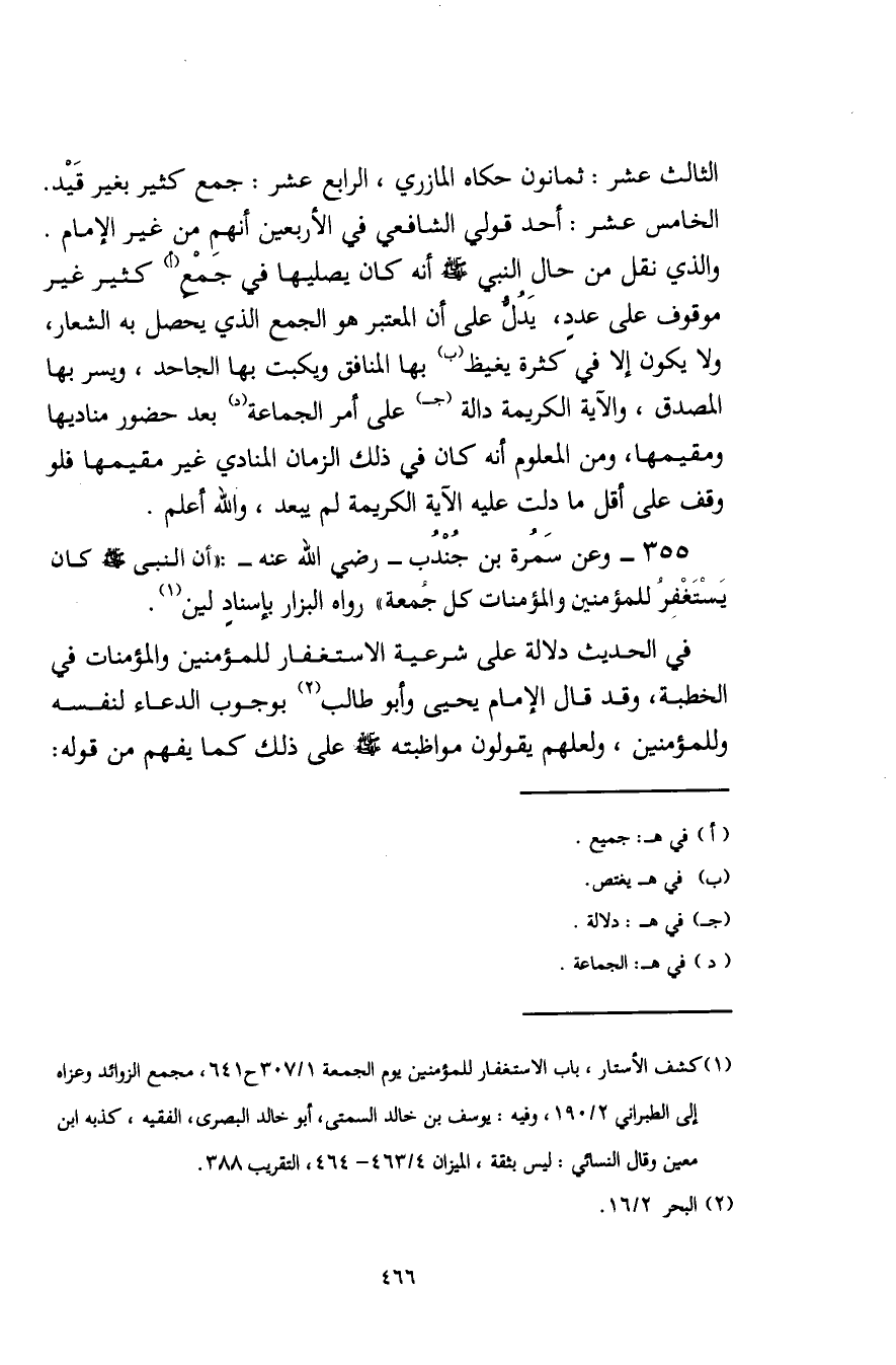 الخامس عشر: أحد قوله الشافعي في الأربعين أنهم من غير الإمام. والذي نقل من حال النبي - صلى الله عليه وسلم - أنه كان يصليها في جَمْعٍ (أ) كثير غير موقوف على عددٍ، يَدُلُّ على أن المعتبر هو الجمع الذي يحصل به الشعار، ولا يكون إلا في كثرة يغيظ (ب) بها المنافق ويكبت بها الجاحد، ويسر بها المصدق، والآية الكريمة دالة (جـ) على أمر الجماعة (د) بعد حضور مناديها ومقيمها، ومن المعلوم أنه كان في ذلك الزمان المنادي غير مقيمها فلو وقف على أقل ما دلت عليه الآية الكريمة لم يبعد، والله أعلم.