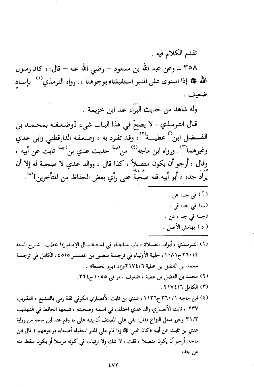 (¬4) ابن ماجه 1/ 360 ح 1136، عدي بن ثابت الأنصاري الكوفي ثقة رمي بالتشيع، التقريب 237، ثابت الأنصاري والد عدي اختلف في اسمه وصحبته، تتبعها الحافظ في التهذيب 3/ 31 وحرر محل النزاع فقال: بقى على المصنف أن ينبه على ما وقع عند ابن ماجه من رواية عدي بن ثابت عن أبيها كان النبي - صلى الله عليه وسلم - إذا قام على المنبر استقبله أصحابه بوجوههم" قال ابن ماجه: أرجو أن يكون متصلا، قلت: لا شك ولا ارتياب في كونه مرسلًا أو يكون سقط منه عن جده.