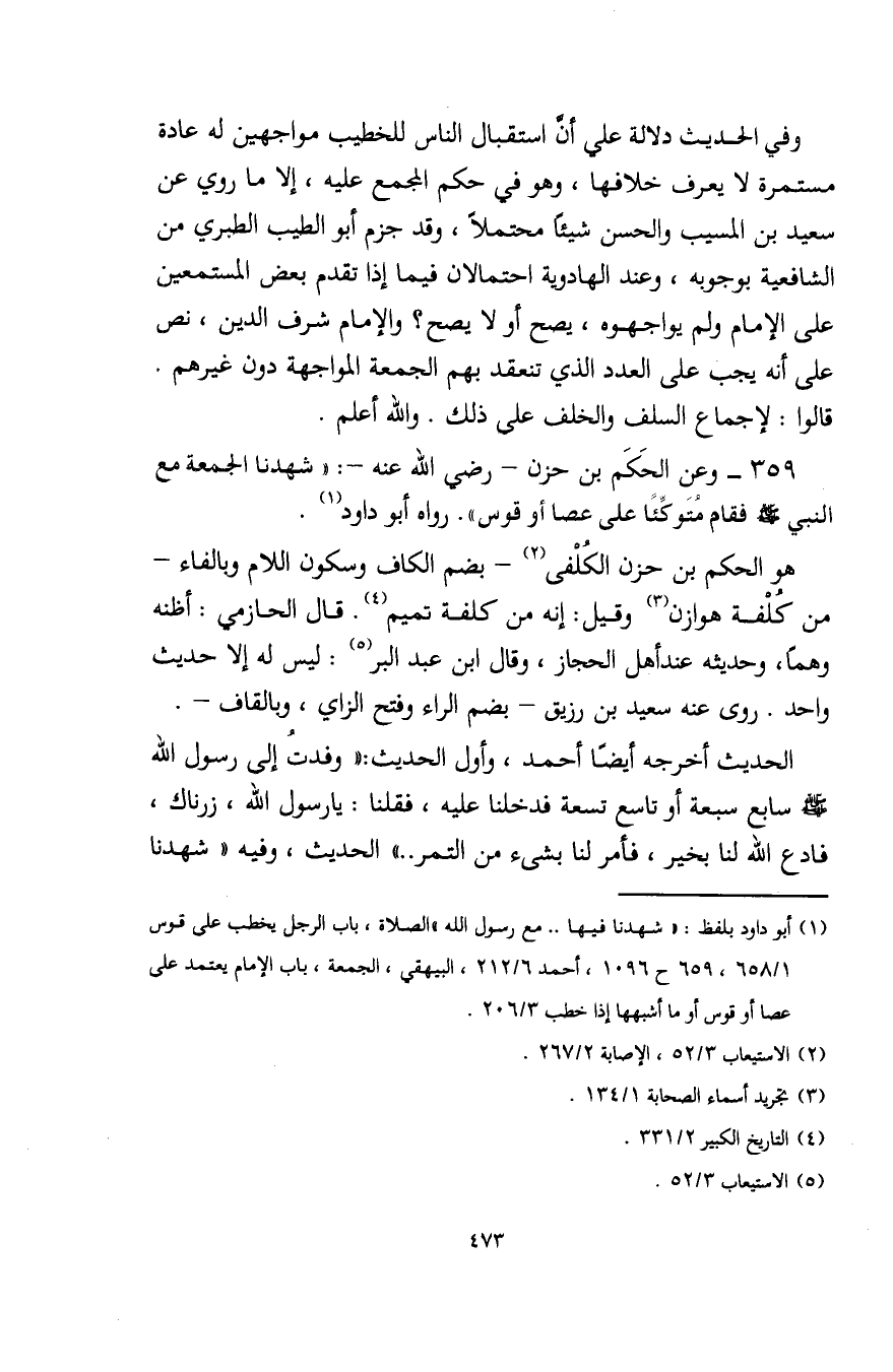 359 - وعن الحَكَم بن حزن - رضي الله عنه -: "شهدنا الجمعة مع النبي - صلى الله عليه وسلم - فقام متوكِّئًا على عصا أو قوس". رواه أبو داود (¬1).