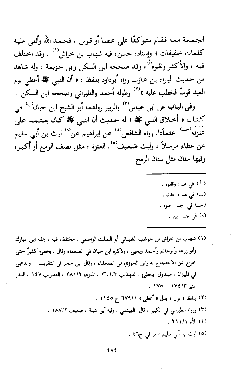 الجمعة معه فقام متوكئًا على عصا أو قوس، فحمد الله وأثنى عليه كلمات خفيفات" وإسناده حسن، فيه شهاب بن خراش (¬1). وقد اختلف فيه، والأكثر وثقوه (أ)، وقد صححه ابن السكن وابن خزيمة، وله شاهد من حديث البراء بن عازب رواه أبو داود بلفظ: "أن النبي - صلى الله عليه وسلم - أعطي يوم العيد قوسًا فخطب عليه" (¬2) وطوله أحمد والطبراني وصححه ابن السكن.