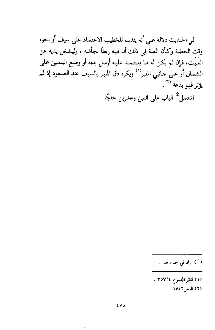 في الحديث دلالة على أنه يندب للخطيب الاعتماد على سيف أو نحوه وقت الخطبة وكأن العلة في ذلك أن فيه ربطًا لجأشه، وليشغل يديه عن العَبَث، فإن لم يكن له ما يعتمد عليه أرسل يديه أو وضع اليمين على الشمال أو على جانبي المنبر (¬1) ويكره دق المنبر بالسيف عند الصعود إذ لم يؤثر فهو بدعة (¬2).