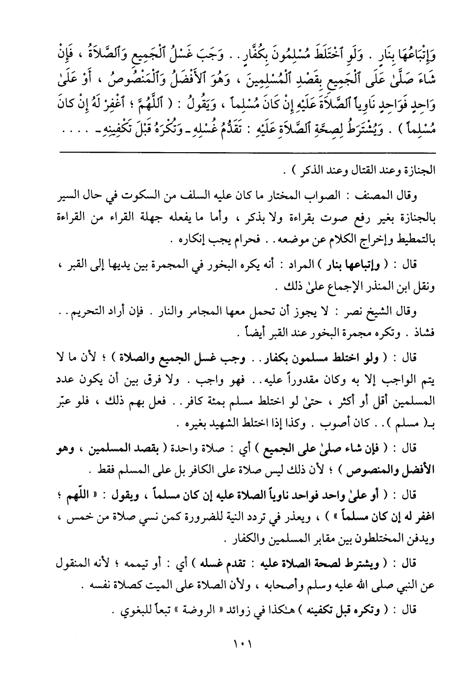 وَاتِّباعها بِنار. وَلُو أَخْتَلِط مُسْلِمُونَ بِكُفّار ... وَجَّبَ غَسَّلَ الجَمِيع وَالصَلاَة، فَإِنَّ شاءَ صَلَّى عَلَى الجَمِيع بِقَصْد المُسْلِمِيْنَ، وَهُوَ الأَفْضَل وَالمَنْصُوص، أَو عَلِيّ وَأَحَدّ فَواحِد ناوَيا الصَلاَة عَلِيّهُ إِن كانَ مُسْلِمًا، وَيَقُول: (اللَهْم؛ أُغَفِّر لَهُ إِن كانَ مُسْلِمًا). وَيَشْتَرِط لَصِحَّة الصَلاَة عَلِيّهُ: تَقَدَّمَ غِسْلهُ - وَتُكْرَه قَبِلَ تَكْفِينَهُ -