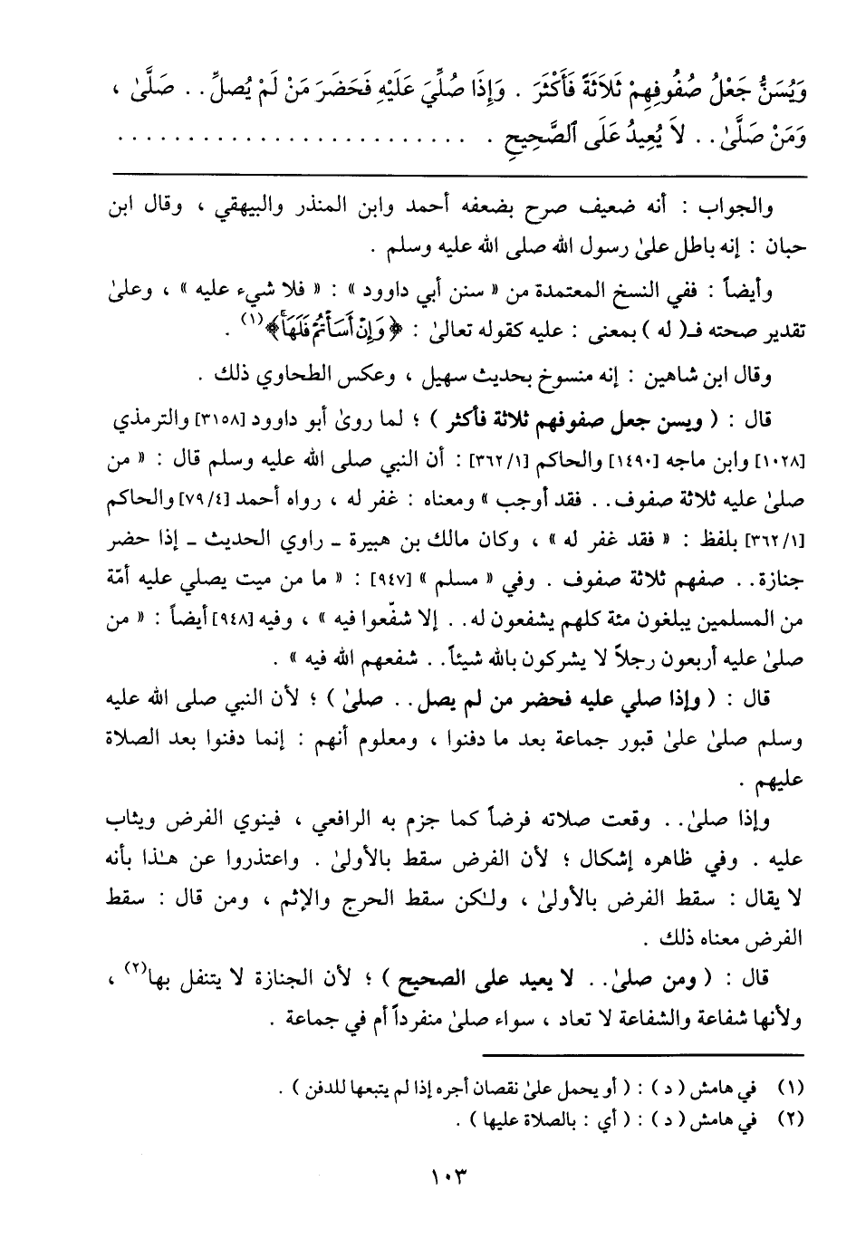 وَيُسِنّ جَعْل صُفُوفهُم ثَلاثَة فَأُكْثِر. وَإِذا صَلَّى عَلِيّهُ فَحَضَرَ مَن لِمَ يَصْلَ ... صَلَّى، وَمَن صَلَّى ... لا يُعِيد عَلَى الصَحِيح