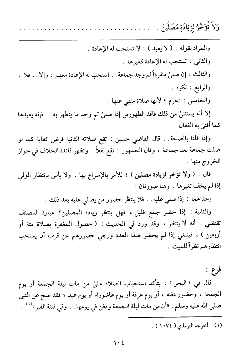 والثانية: إذا حضر جمع قليل، فعل ينتظر زيادة المصلين؟ عبارة المصنف تقتضي: أنه لا ينتظر، وقد ورد في الحديث: (حصول المغفرة بصلاة مئة أو أربعين)، فينبغي إذا لم يحضر هذا العدد ورجي حضورهم عن قرب أن يستحب انتظارهم نظرًا للميت.