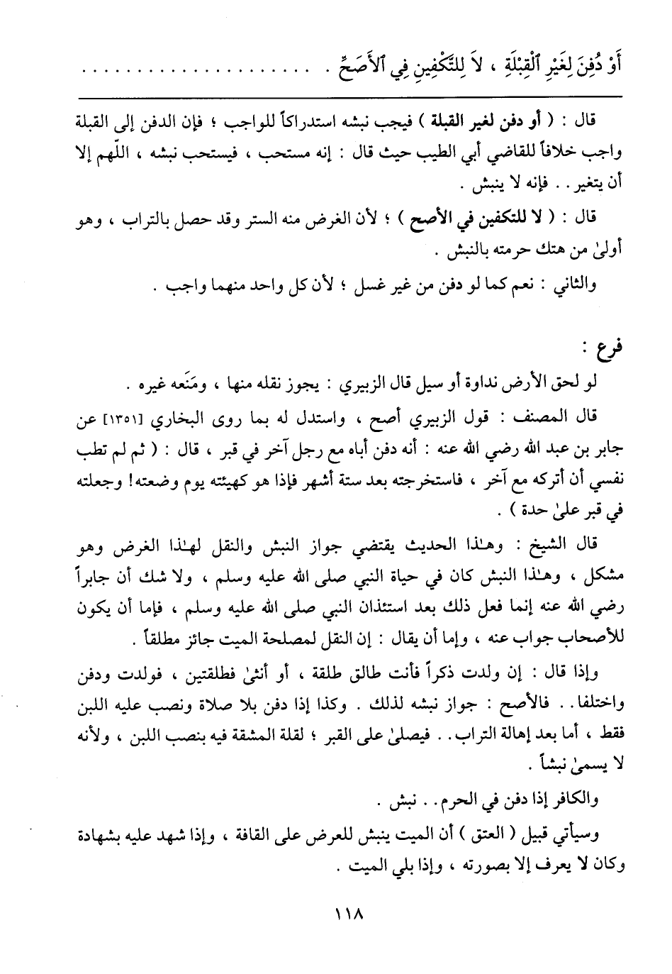 قال: (أو دفن لغير القبلة) فيجب نبشه استدركًا للواجب؛ فإن الدفن إلى القبلة واجب خلافًا للقاضي أبي الطيب حيث قال: إنه مستحب, فيستحب نبشه, اللهم إلا أن يتغير .. فإنه لا ينبش.