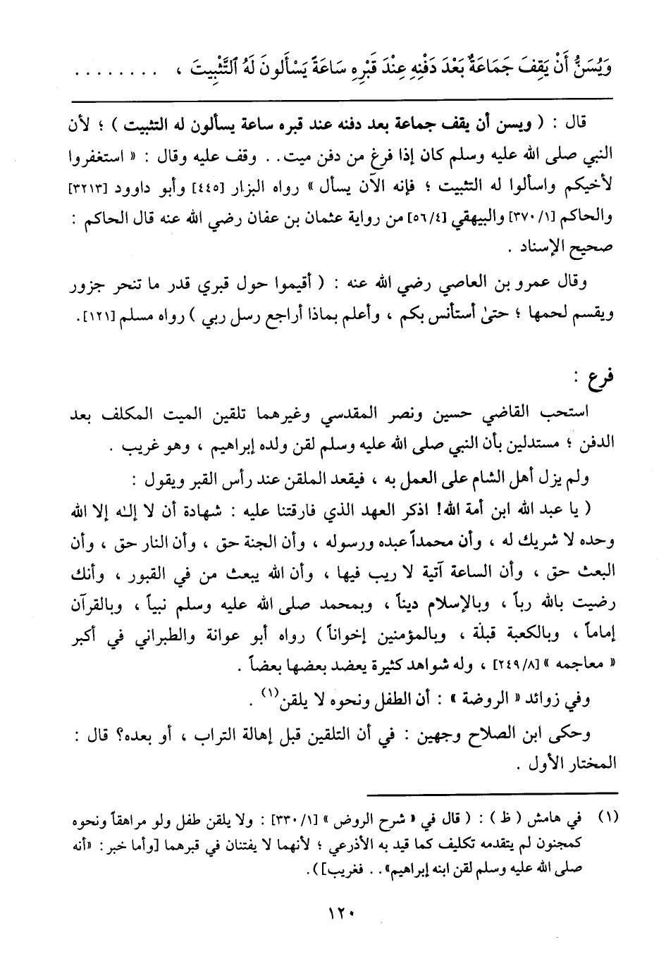 قال: (ويسن أن يقف جماعة بعد دفنه عند قبره ساعة يسألون له التثبيت)؛ لأن النبي صلى الله عليه وسلم كان إذا فرغ من دفن ميت .. وقف عليه وقال: (استغفروا لأخيكم واسألوا له التثبيت؛ فإنه الآن يسأل) رواه البزار [445] وأبو داوود [3213] والحاكم [1/ 370] والبيهقي [4/ 56] من رواية عثمان ابن عفان رضي الله عنه قال الحاكم: صحيح الإسناد.