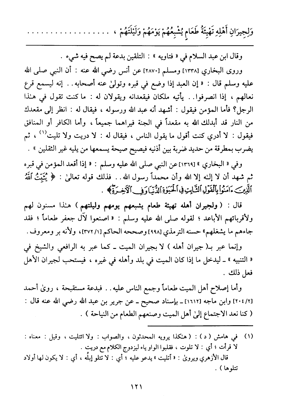 وَلجِيرَانِ أهلِهِ تَهيِئَةُ طَعَامٍ يُشبِعُهُم يَومَهُم وَلَيلَتهُم,