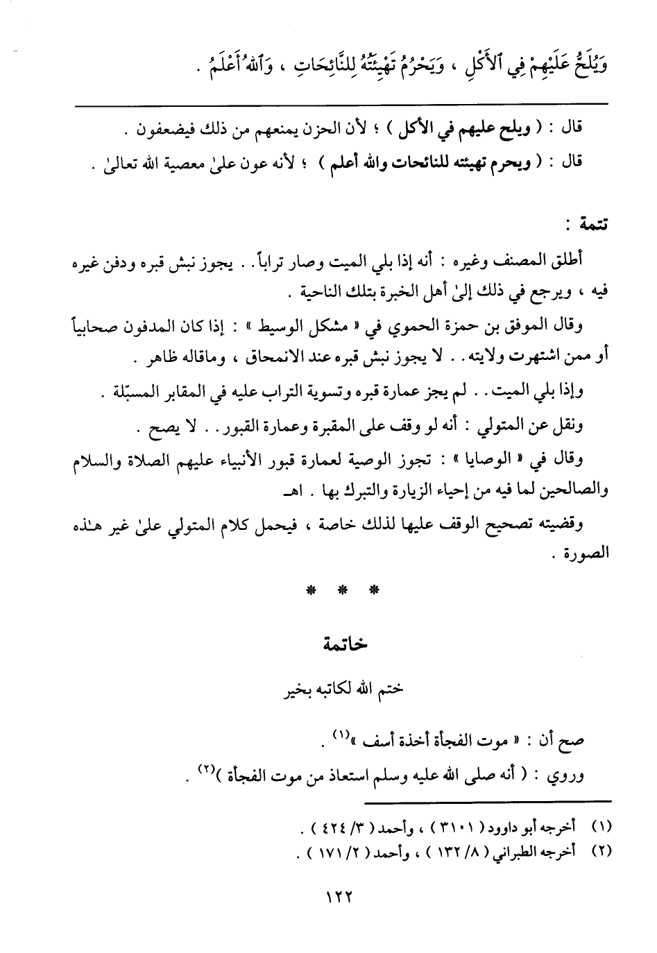 وقال الموفق ابن حمزة الحموي في (مشكل الوسيط): إذا كان المدفون صحابيًا أو ممن اشتهرت ولايته .. لا يجوز نبش قبره عند الانمحاق, وما قاله ظاهر.