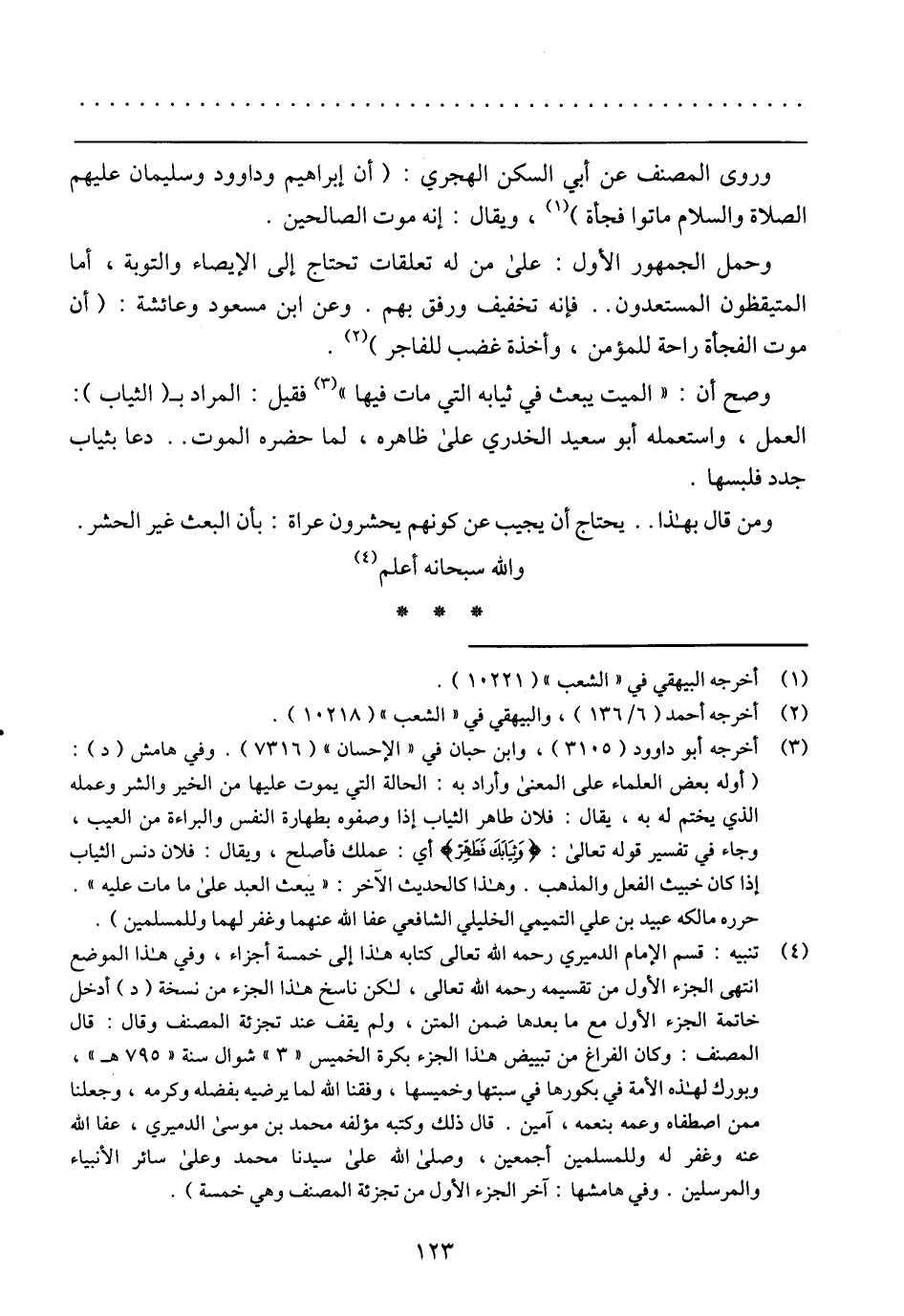 وروى المصنف عن أبي السكن الهجري: (أن إبراهيم وداوود وسليمان عليهم الصلاة والسلام ماتوا فجأة) , ويقال: إنه موت الصالحين.