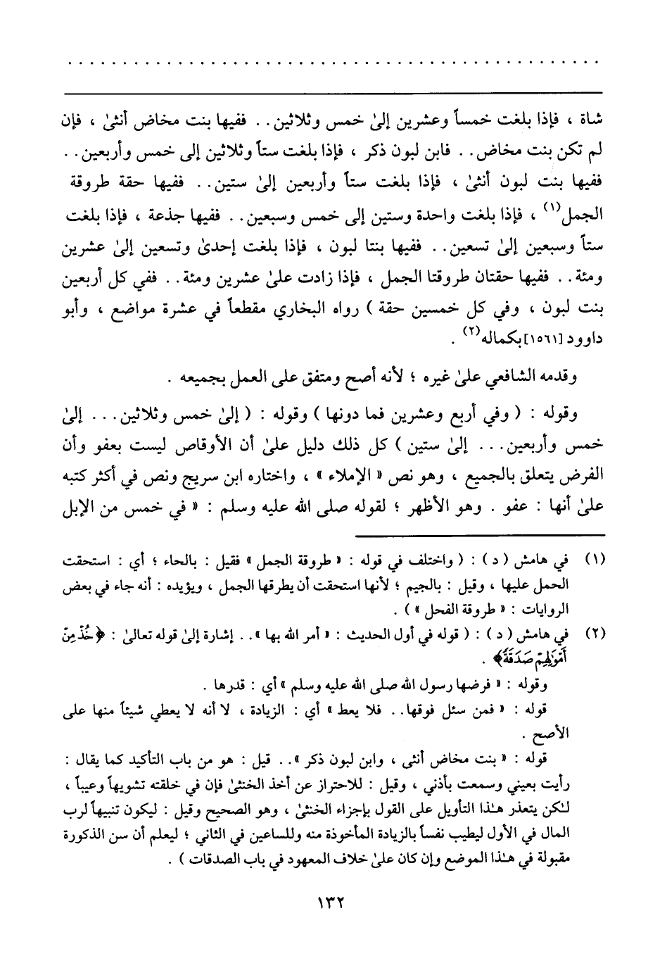 شاة, فإذا بلغت خمسًا وعشرين إلى خمس وثلاثين .. ففيها بنت مخاض أنثى, فإن لم تكن بنت مخاض .. فأبن لبون ذكر, فإذا بلغت ستًا وثلاثين إلى خمس وأربعين .. ففيها بنت لبون أنثى, فإذا بلغت واحدة وستون إلى خمس وسبعين .. ففيها جذعة, فإذا بلغت ستًا وسبعين إلى تسعين .. ففيها بنتا لبون, فإذا بلغت إحدى وتسعين إلى عشرين ومئة .. ففيها حقتان طروقتا الجمل, فإذا زادت على عشرين ومئة .. ففي كل أربعين بنت لبون, وفي كل خمسين حقة) رواه البخارس مقطعًا في عشرة مواضع, وأبو داوود [1561] بكماله.