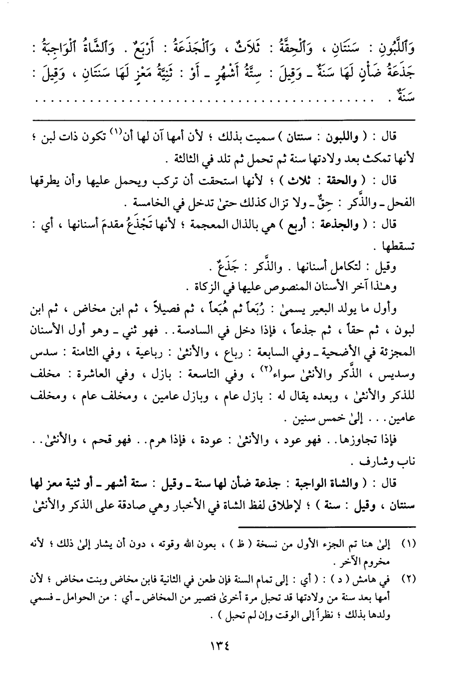 واللَّبُونِ: سَنَتَانِ, وَالحِقَّةُ: ثَلاَث, ٌ وَالجَذعَةُ: أَربَعٌ. وَالشَّاةُ الوَاجِبَةُ: جَذعَةُ ضَأنٍ لهَاَ سَنَةٌ – وَقِيلَ: سِتَّةُ أَشهُرٍ – أَو: ثَنِيةُ مَعزٍ لَها سَنَتَانِ, وَقِيلَ: سَنَةٌ
