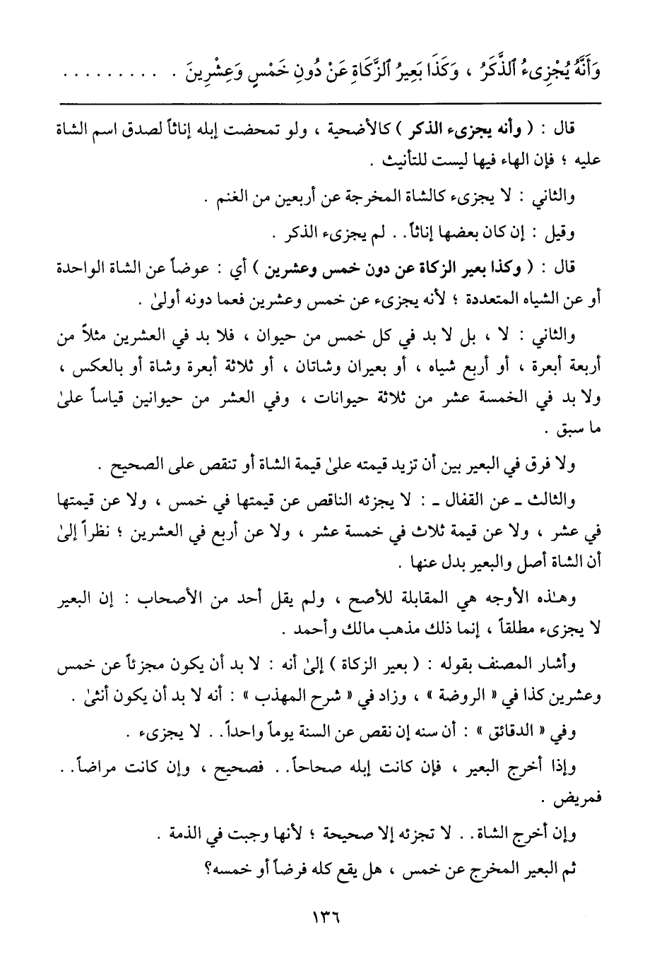 والثاني: لا، بل لابد في كل خمس من حيوان، فلابد في العشرين مثلًا من أربعة أبعرة، أو أربع شياه، أو بعيران وشاتان، أو ثلاثة أعبرة وشاة أو بالعكس، ولابد في الخمسة عشر من ثلاثة حيوانات، وفي العشر من حيوانين قياسًا على ما سبق.
