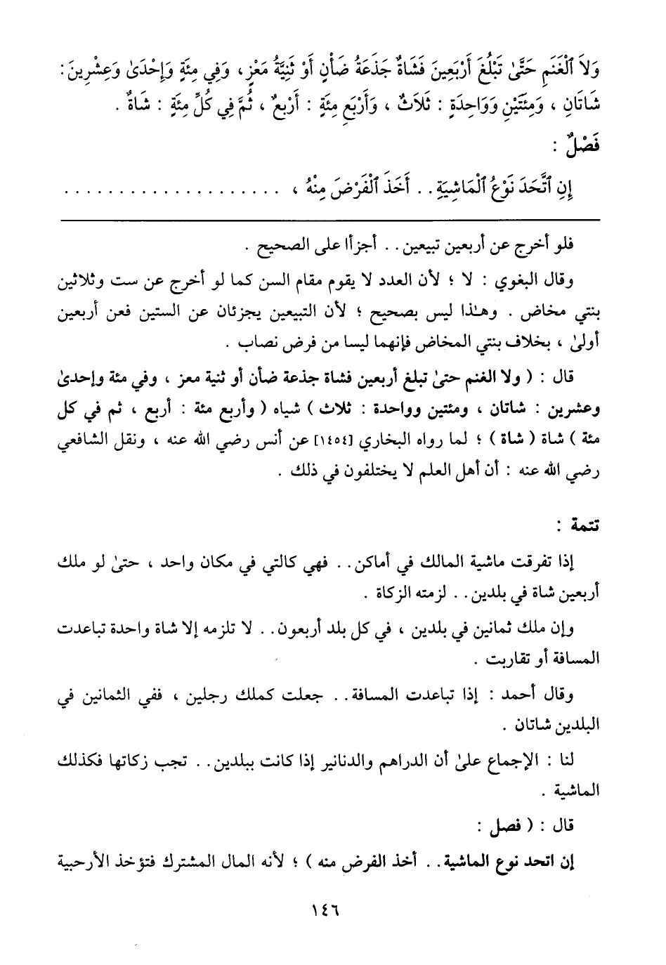قال: (ولا الغنم حتى تبلغ أربعين فشاة جذعة ضأن أو ثنية معز، وفي مئة وإحدى وعشرين: شاتان، ومئتين وواحدة: ثلاث) شياه (وأربع مئة: أربع، ثم في كل مئة) شاة (شاة)؛ لما رواه البخاري [1454] عن أنس رضي الله عنه، ونقل الشافعي رضي الله عنه: أن أهل العلم لا يختلفون في ذلك.