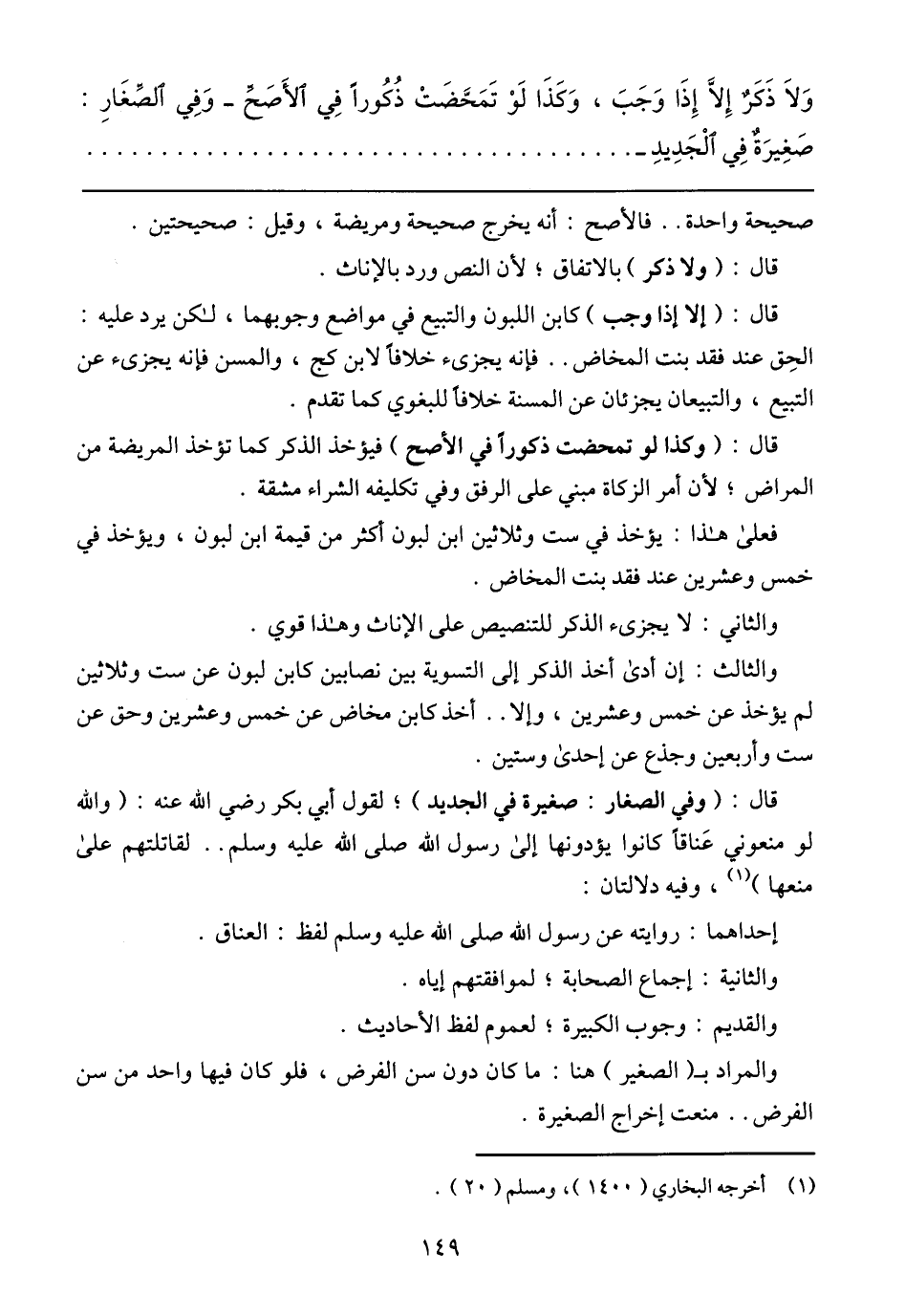 قال: (وفي الصغار: صغيرة في الجديد)؛ لقول أبي بكر رضي الله عنه: (والله لو منعوني عناقًا كانوا يؤدونها إلى رسول الله صلى الله عليه وسلم .. لقاتلتهم على منعها)، وفيه دلالتان: