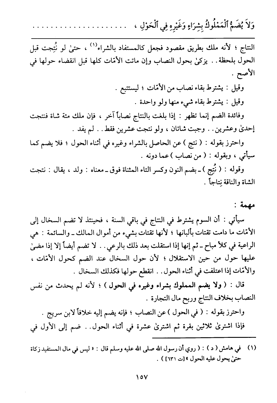 قال: (ولا يضم المملوك بشراء وغيره في الحول)؛ لأنه لم يحدث من نفس النصاب بخلاف النتاج وربع مال التجارة.