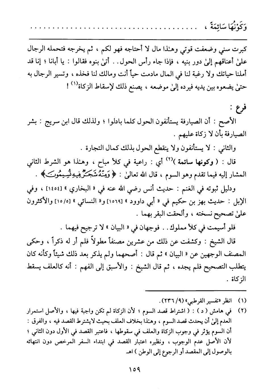 قال: (وكونها سائمة) أي: راعية في كلأ مباح، وهذا هو الشرط الثاني المشار إليه فيما تقدم وهو السرم، قال الله تعالى: {وَمِنْهُ شَجَرٌ فِيهِ تُسِيمُونَ}.