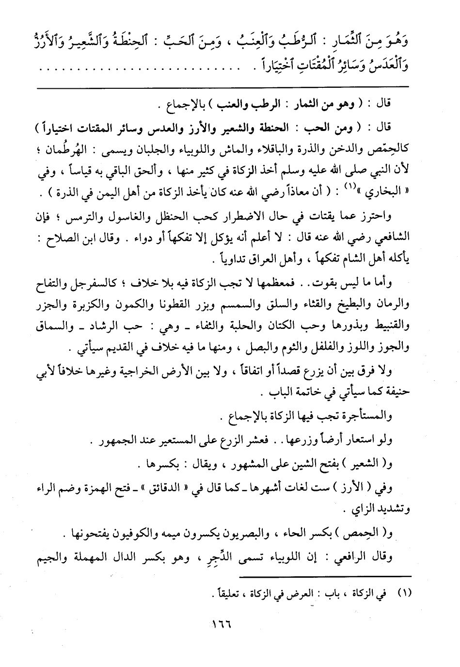 وَهُوَ مِنَ الثَّمَارِ: الرُّطَبُ وَالْعِنَبُ, وَمِنَ الحَبَّ: الحِنْطَةُ وَالشَّعِيرُ وَالأَرُزُّ وَالْعَدَسُ وَسَائِرُ الْمُقْتَاتِ اخْتِيارًا