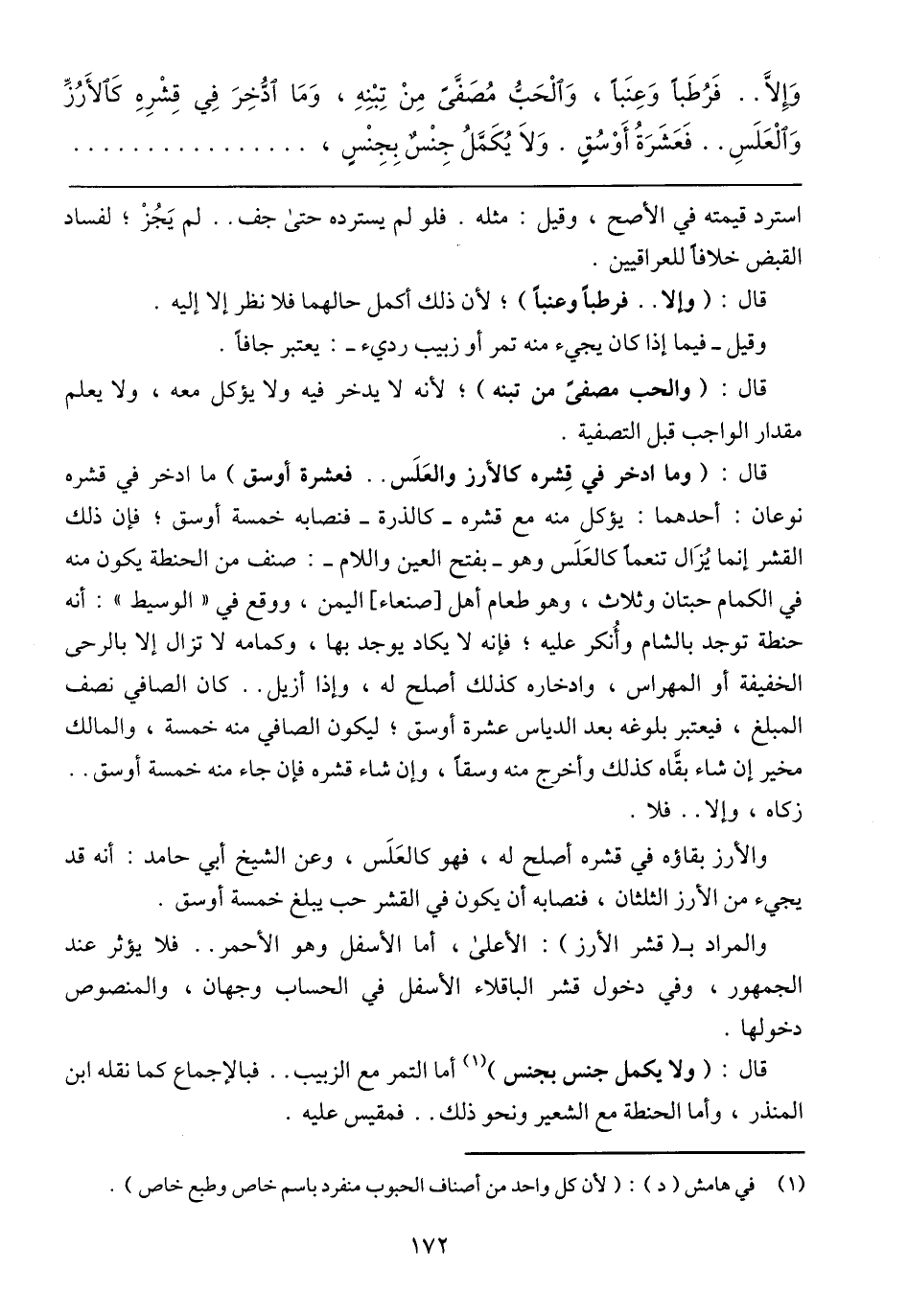 وَإِلاَّ .. فَرُطَبًا وَعِنَبًا، وَالْحَبُّ مُصَفي مِنْ تِبْنِهِ، وِمِا ادُّخِرَ في قِشْرِهِ كَالأّرُزِّ وَالْعَلَسِ .. فَعَشَرَةُ أَوْسُقٍ. وَلاَ يُكَمَّلَ جِنْسٌ بِجِنْسٍ،