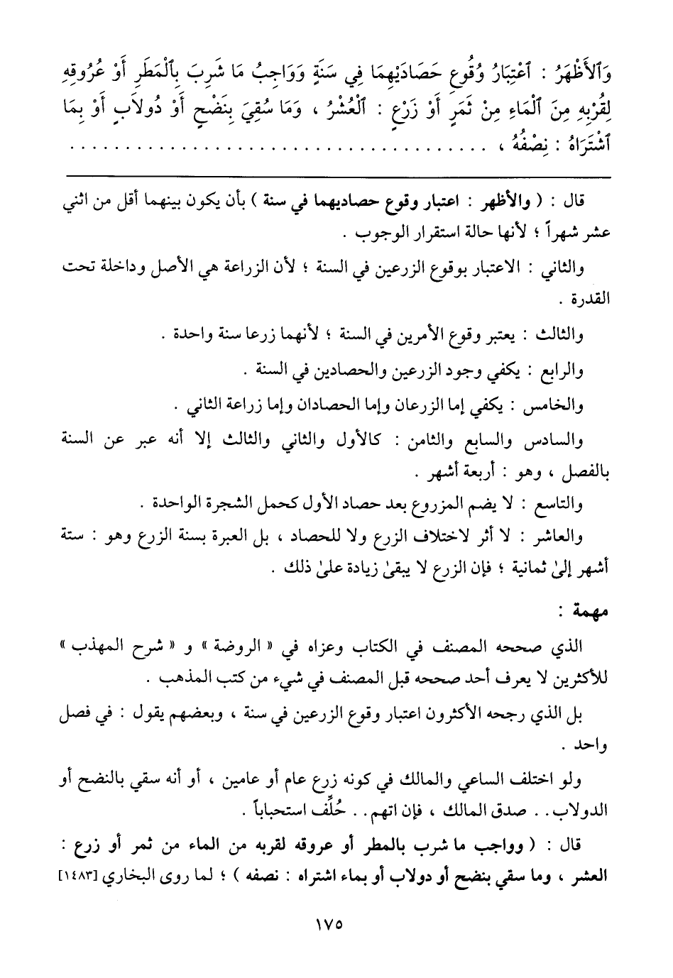 وَالأَظْهَرُ: اعْتِبَارُ وُقُوعِ حَصَادَيْهِمَا في سَنَةٍ وَوَضاجبُ مَا شَرِبَ بالْمَطَرِ أَوْ عُرُوِقهِ لِقُرْبِهِ مِنَ الْمَاءِ مِنْ ثَمَرٍ أَوْ زِرْعٍ: الًعُشْرُ، وَمَا سُقِيَ بِنَضْحٍ أَوْ دُولاَبٍ أَوْ بِمَا اشْتَرَاهُ: نِصْفُهُ،