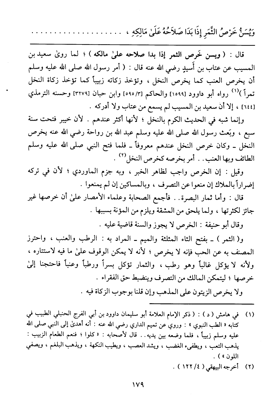 قال: (ويسن خَرص الثمر إذا بدا صلاحه على مالكه)؛ لما روى سعيد بن المسيب عن عتاب بن أسيد رضي الله عنه قال: (أمر رسول صلى الله عليه وسلم أن يخرص العنب كما يخرص النخل، وتؤخذ زكاته زبيبًا كما تؤخذ زكاة النخل تمرًا) رواه أبوا داوود [1599] والحاكم [3/ 595] وابن حبان [3279] وحسنه الترمذي [644]، إلا أن سعيد بن المسيب لم يسمع من عتاب ولا أدركه.