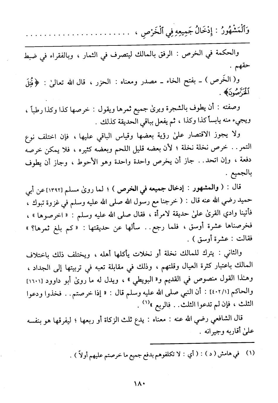 قال: (والمشهور: إدخال جميعه في الخرص)؛ لما روى مسلم [1392] عن أبي حميد رضي الله عنه قال: (خرجنا مع رسول الله صلى الله عليه وسلم في غزوة تبوك، فأتينا وادي القرى على حديقة لامرأة، فقال صلى عليه وسلم: (اخرصوها)، فخرصناها عشرة أوسق، فلما رجع .. سألها عن حديقتها: (كم بلغ ثمرها؟) فقالت: عشرة أوسق).