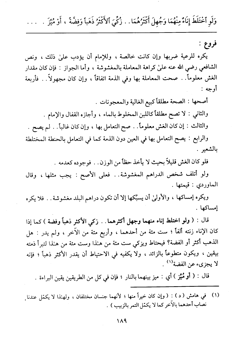 ويكره إمساكها، والأولى أن يسبُكها إلا أن تكون دراهم البلد مغشوشة .. فلا يكره إمساكها. قال: (ولو اختلط إناء منهما وجهل أكثرهما .. زكى الأكثر ذهبًا وفضة) كما إذا كان الإناء زنته ألفًا؛ ست مئة من أحدهما، وأربع مئة من الآخر، ولم يدر: هل الذهب أكثر أو الفضة؟ فيحتاط ويزكي ست مئة من هذا وست مائة من هذا لتبرأ ذمته بيقين، ويكون متطوعًا بالزائد، ولا يكفيه في الاحتياط أن يقدر الأكثر ذهبًا؛ فإنه لا يجزئ عن الفضة.