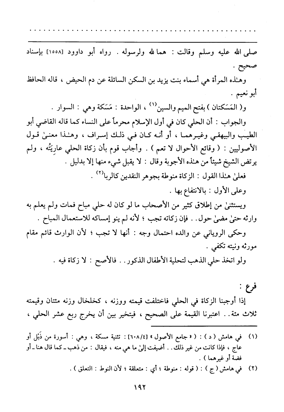 و (المسكتان) بفتح الميم والسين, الواحدة: مسكة وهي: السوار والجواب: أن الحلي كان في أول الإسلام