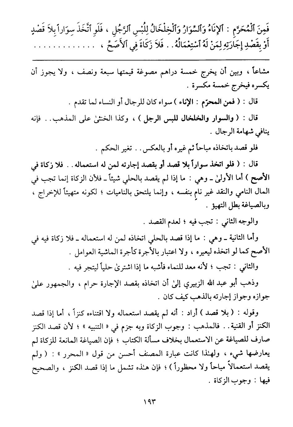 فَمِنَ المُحَرَّمِ: الإِنَاءُ وَالسُوَارُ وَالخِلْخَالُ لِلُبْسِ الرَّجُلِ , فَلَوِ أتَّخَذَ سِوَارًا بِلَا قَصْدٍ أَوْ بِقَصْدِ إِجَارَتِهِ لِمَنْ لَهُ اسْتِعْمَالُهٌ .. فَلَا زَكَاةَ فِي الأَصَحِّ ,