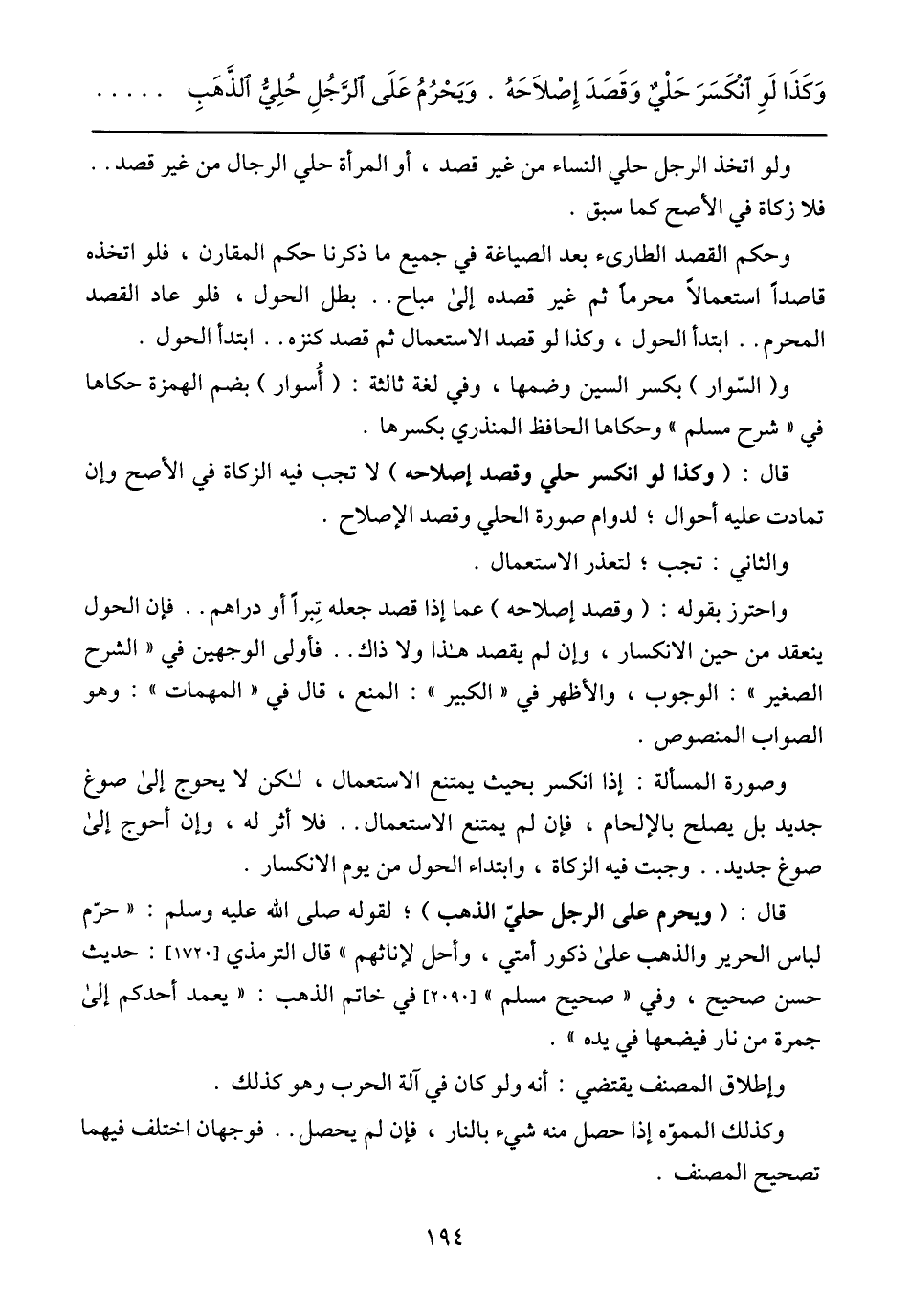 واحترز بقوله: (وقصد إصلاحه) عما إذا قصد جعله تبرا أو دراهم .. فإن الحول ينعقد من حين الانكسار , وإن لم يقصد هذا ولا ذاك .. فأولى الوجهين في (الشرح الصغير): الوجوب , والأظهر في (الكبير): المنع , قال في (المهمات): وهو الصواب المنصوص.