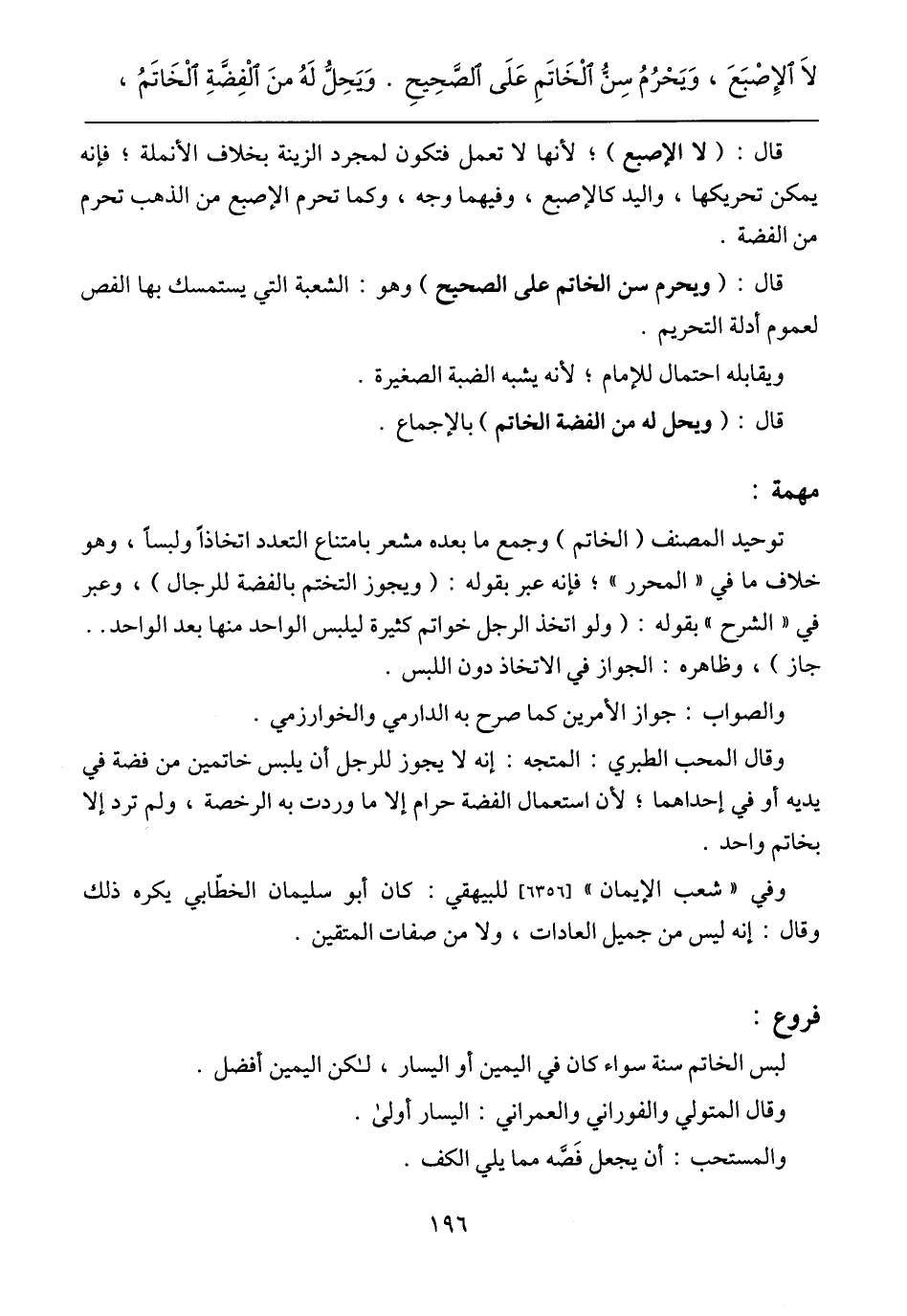 قال: (لا الإصبع)؛ لأنها لا تعمل فتكون لمجرد الزينة بخلاف الأنملة؛ فإنه يمكن تحريكها، واليد كالإصبع، وفيهما وجه، وكما تحرم الإصبع من الذهب تحرم من الفضة.