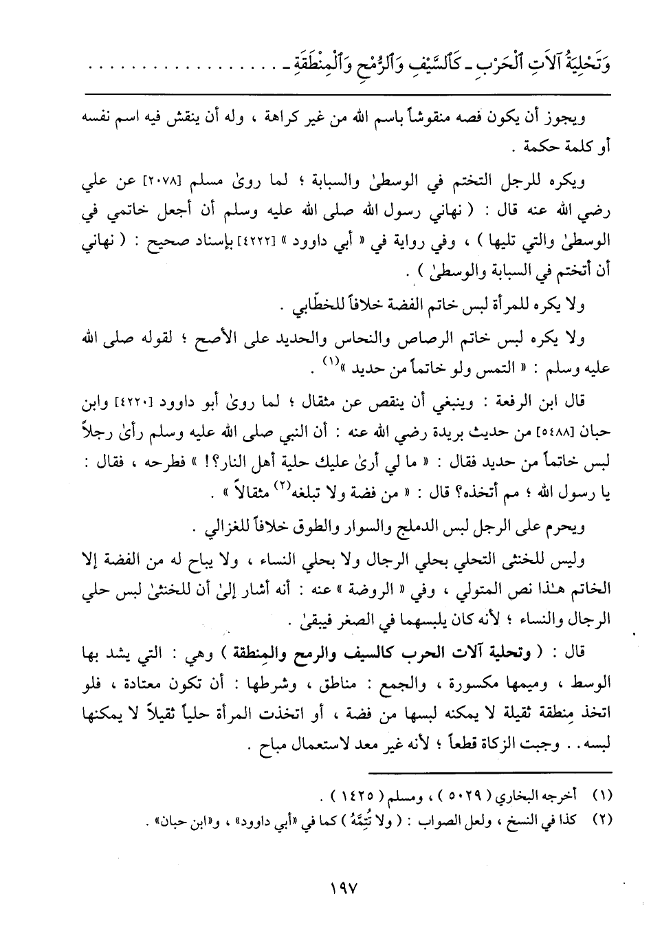 قال: (وتحلية آلات الحرب كالسيف والرمح والمِنطقة) وهي: التي يشد بها الوسط، وميمها مكسورة، والجمع: مناطق، وشرطها: أن تكون معتادة، فلو اتخذ مِنطقة ثقيلة لا يمكنه لبسها من فضة، أو اتخذت المرأة حليًا ثقيلًا لا يمكنها لبسه .. وجبت الزكاة قطعًا؛ لأنه غير معد لاستعمال مباح.