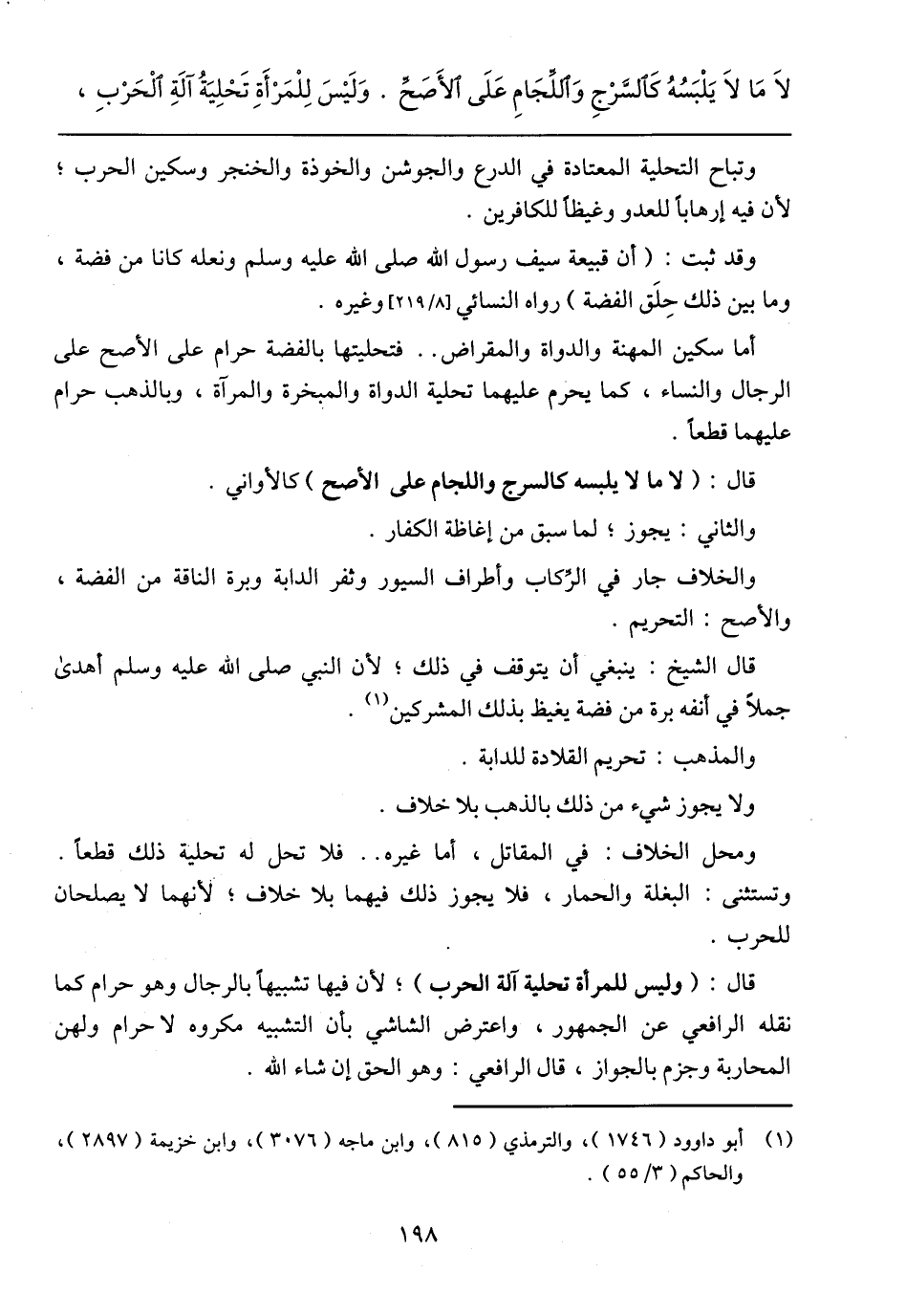 لاَ مَا لاَ يَلْبَسُهُ كَالسَّرْجِ وَاللِّجَامِ عَلَى الأَصَحِّ. وَلَيْسَ لِلْمَرْأَةِ تَحْلِيَةُ آلَةِ الْحَرْبِ،