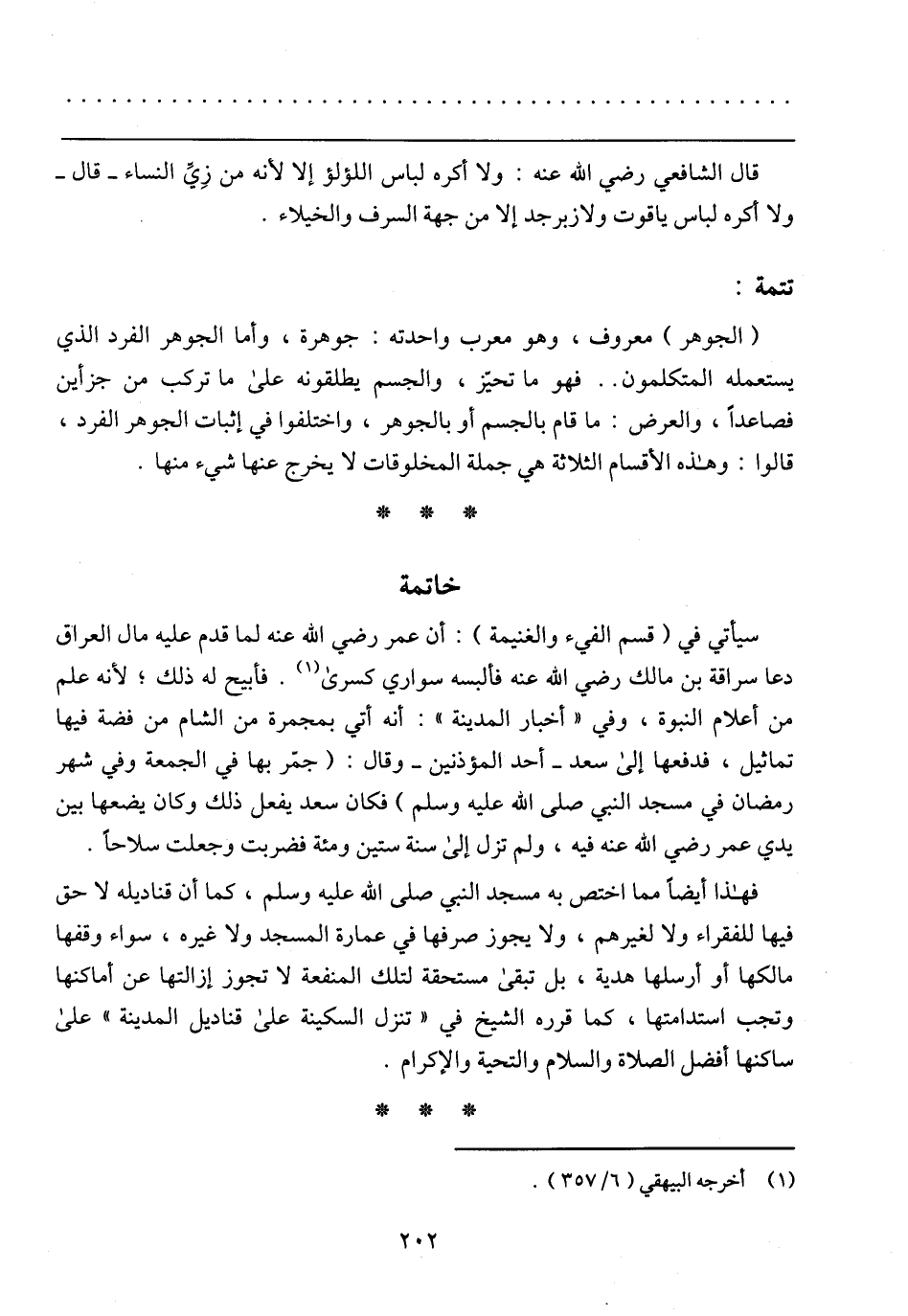 سيأتي في (قسم الفيء والغنيمة): أن عمر رضي الله عنه لما قدم عليه مال العراق دعا سراقة بن مالك رضي الله عنه فألبسه سواري كسري. فأبيح له ذلك؛ لأنه علم من أعلام النبوة، وفي (أخبار المدينة): أن أتي بمجمرة من الشام من فضة فيها تماثيل، فدفعها إلى سعد – أحد المؤذنين- وقال: (جمّر بها في الجعبة وفي شهر رمضان في مسجد النبي صلى الله عليه وسلم) فكان سعد يفعل ذلك وكان يضعا بين يدي عمر رضي الله عن فيه، ولم تزل إلى سنة ستين ومئة فضرت وجعلت سلاحًا.