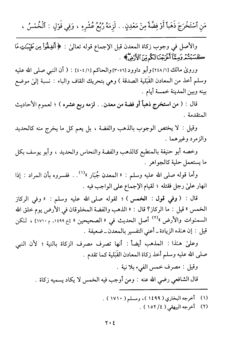 قال: (وفي قول: الخمس)؛ لقوله صلى الله عليه وسلم: (وفي الركاز الخمس) قيل: ما الركاز؟ قال: (الذهب والفضة والمخلوقان في الأرض يوم خلق الله السموات والأرض) أصل الحديث في الصحيحين [خ1499 – 1710]، لكن قيل: إن هذه الزيادة – أعني التفسير بالمعدن – ضعيفة.