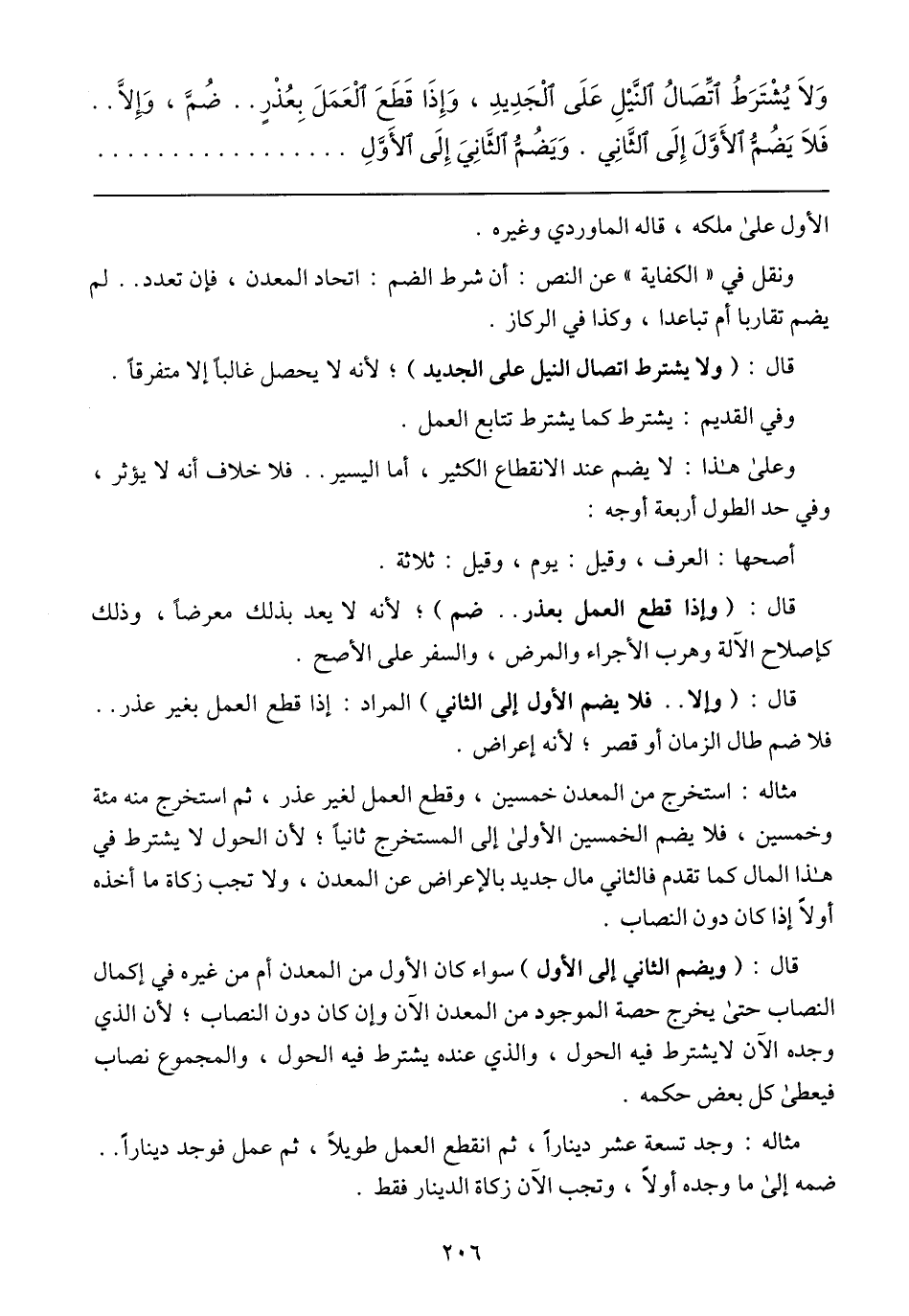 مثاله: استخراج من المعدن خمسين، وقطع العمل لغير عذر، ثم استخرج منه مئة وخمسين، فلا يضم الخمسين الأولى إلى المستخرج ثانيًا؛ لأن الحول لا يشترط في هذا المال كما تقدم فالثاني مال جديد بالإعراض عن المعدن، ولا تجب زكاة ما أخذه أولًا إذا كان دون النصاب.