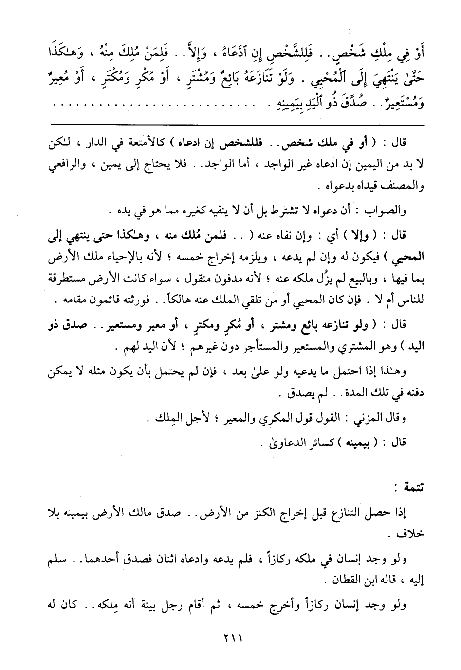 قال: (وإلا) أي: وإن نفاه عنه (... فلمن ملك منه، وهكذا حتى ينتهي إلى المحيي) فيكون له وإن لم يدعه، ويلزمه إخراج خمسه؛ لأنه بالإحساء ملك الأرض بما فيها، وبالبيع لم يزل ملكه عنه؛ لأنه مدفون منقول، سواء كانت الأرض مستطرقة للناس أم لا. فإن كان المحيي أو من تلقي الملك عنه هالكا ... فورثته قائمون مقامه.