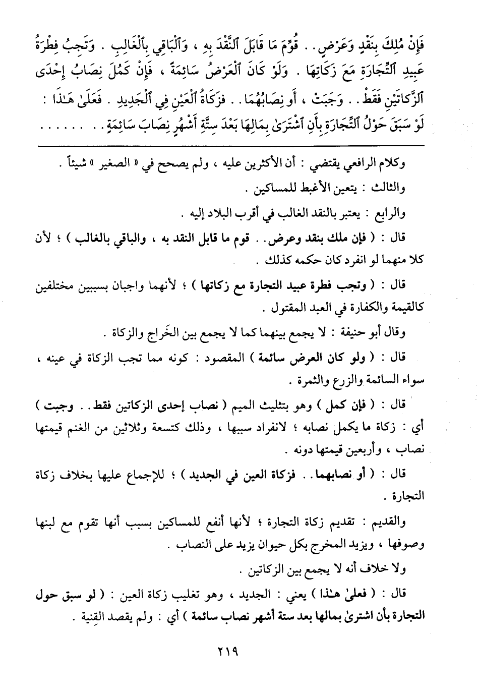 فَإِنْ مُلِكَ بِنَقْدٍ وَعَرْضٍ .. قُوِّمَ مَا قَابَلَ النَّقْدَ بِهِ، وَالْبَاقِي بِالْغَالِبِ. وَتَجِبُ فِطْرَةُ عَبِيدِ التِّجَارَةِ مَعَ زَكَاتِهَا. وَلَوْ كَانَ الْعَرْضُ سَائِمَةً، فَإِنْ كَمُلَ نِصَابُ إِحْدَى الزَّكاتَيْنِ فَقَطْ .. وَجَبَتْ، أَو نِصَابُهُمَا .. فزَكَاةُ الْعَيْنِ فِي الْجَدِيدِ. فَعَلَى هَذَا: لَوْ سَبَقَ حَوْلُ التِّجَارَةِ بِأَنِ اشْتَرَى بِمَالِهَا بَعْدَ سِتَّةِ أَشْهُرٍ نِصَابَ سَائِمَةٍ