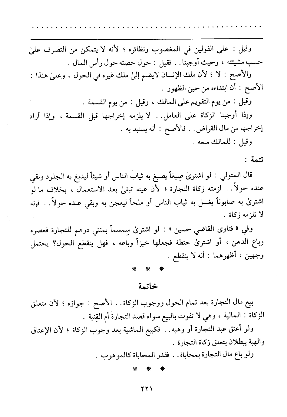 وفي (فتاوى القاضي حسين): لو اشترى سمسمًا بمئتي درهم للتجارة فعصره وباع الدهن، أو اشترى حنطة فجعلها خبزًا وباعه، فهل ينقطع الحول؟ يحتمل وجهين، أظهرهما: أنه لا ينقطع.