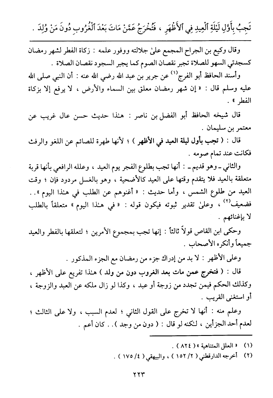 والثاني - وهو قديم -: أنها تجب بطلوع الفجر يوم العيد، وعلله الرافعي بأنها قربة معلقة بالعيد فلا يتقدم وقتها على العيد كالأضحية، وهو بالغسل مردود فإن؛ وقت العيد من طلوع الشمس، وأما حديث: (أغنوهم عن الطلب في هذا اليوم) .. فضعيف، وعلى تقدير ثبوته فيكون قوله: (في هذا اليوم) متعلقًا بالطلب لا بإغنائهم.