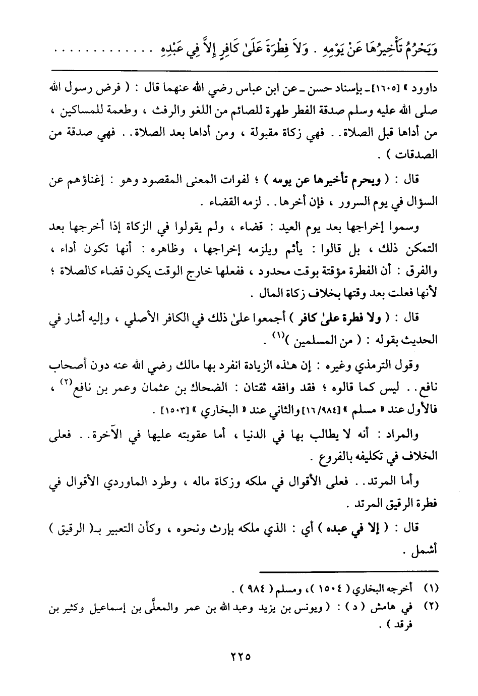وَيَحْرُمُ تَأْخِيرُهَا عَنْ يَوْمِهِ. وَلاَ فِطْرَةَ عَلَى كَافِرٍ إِلاَّ فِي عَبْدِهِ