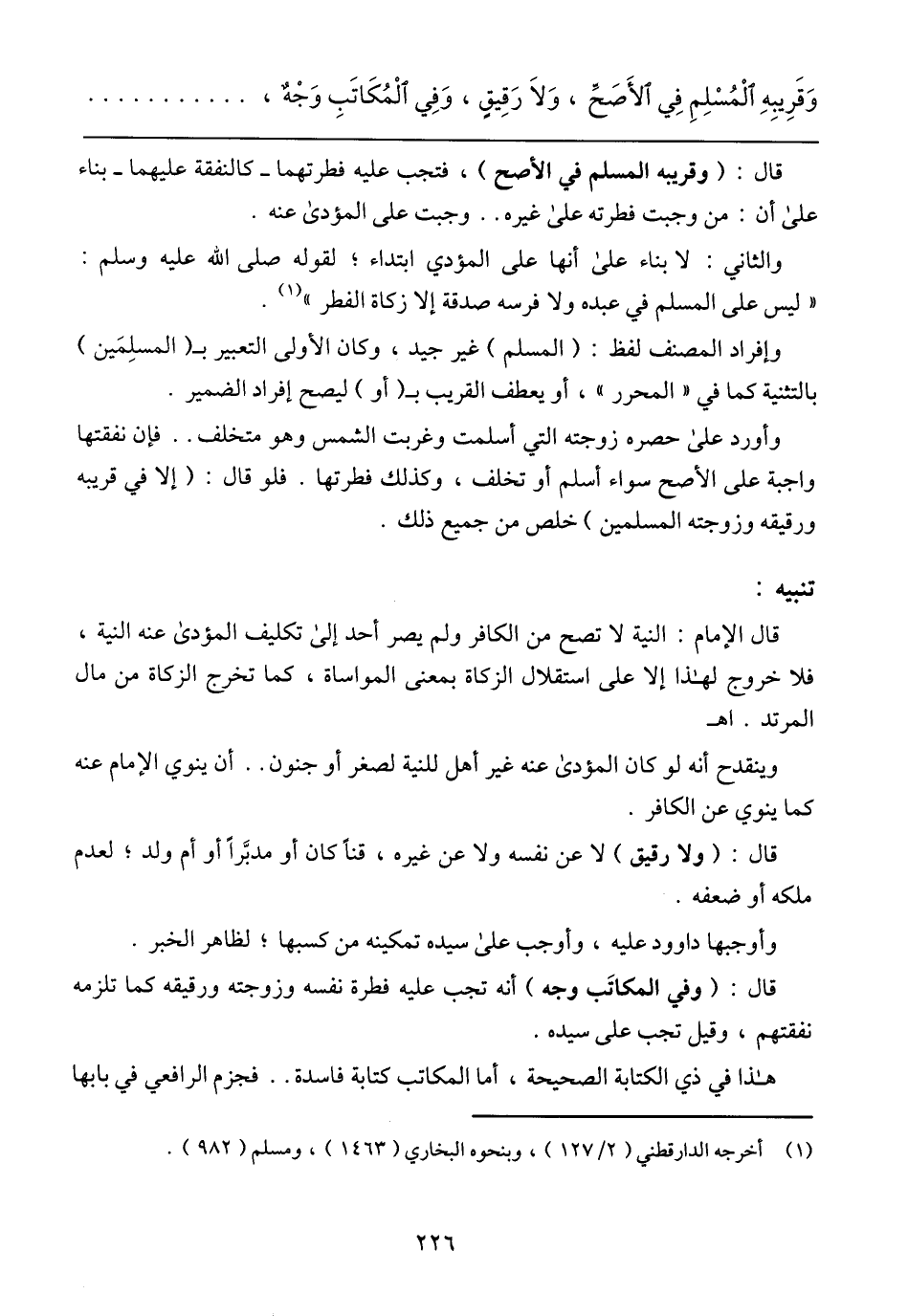 وَقَرِيِبهِ اٌلْمُسْلِمِ فِي اٌلأَصحِّ، وَلاَ رَقِيقٍ، وَفِي اٌلْمُكَاتَبِ وَجْهٌ،